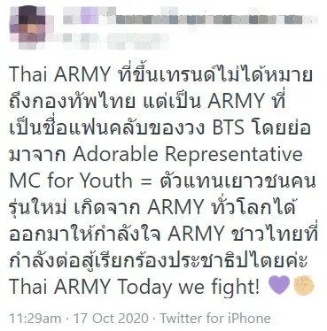 “Army” เป็นอีกหนึ่งพลังแฟนคลับของไอดอลเกาหลีระดับโลกอย่าง วง BTS ที่รวมใจกันเป็นหนึ่งเพื่อเรียกร้องประชาธิปไตย โดยหลังจาก เมื่อคืนวาน 16 ตค. 63 เวลา 18:50 เกิดเหตุการณ์ สลายการชุมนุม “แยกประทุมวัน” เจ้าหน้าที่ทำการสลายการชุมนุม ด้วยการใช้รถฉีดน้ำเเรงดันสูง โดยน้ำสีฟ้า มีส่วนผสมของ แก๊สน้ำตา ทำให้เกิดการระคายเคืองได้ และก็ได้ มีภาพนักศึกษาก้มกราบเจ้าหน้าที่ เพื่อร้องขอความเป็นธรรม ซึ่งเป็นภาพที่เห็นเเล้ว ประชาชนต่างรู้สึกหดหู่ต่อสถานการณ์ที่เจ้าหน้าที่สลายการชุมนุม ซึ่งในเหตุการณ์ ก็มีเเต่พลังของเด็กเเละนักศึกษาจำนวนมาก