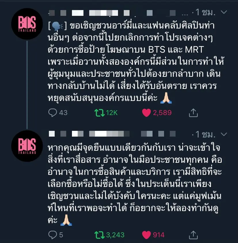 ล่าสุด แฟนคลับชาวไทยของ วง BTS อย่าง “Army” ออกมาประกาศจุดยืนอีกครั้ง พร้อมรวมพลังยกเลิกโปรเจกต์ต่างๆ ที่เป็นโปรเจกต์เกี่ยวกับการซื้อโฆษณาบนรถไฟฟ้าเช่น BTS และ MRT เพราะสืบเนื่องจากทั้งสององค์กร มีส่วนทำให้ผู้ชุมนุมและประชาชนทั่วไปไม่สามารถเดินทางกลับบ้านได้