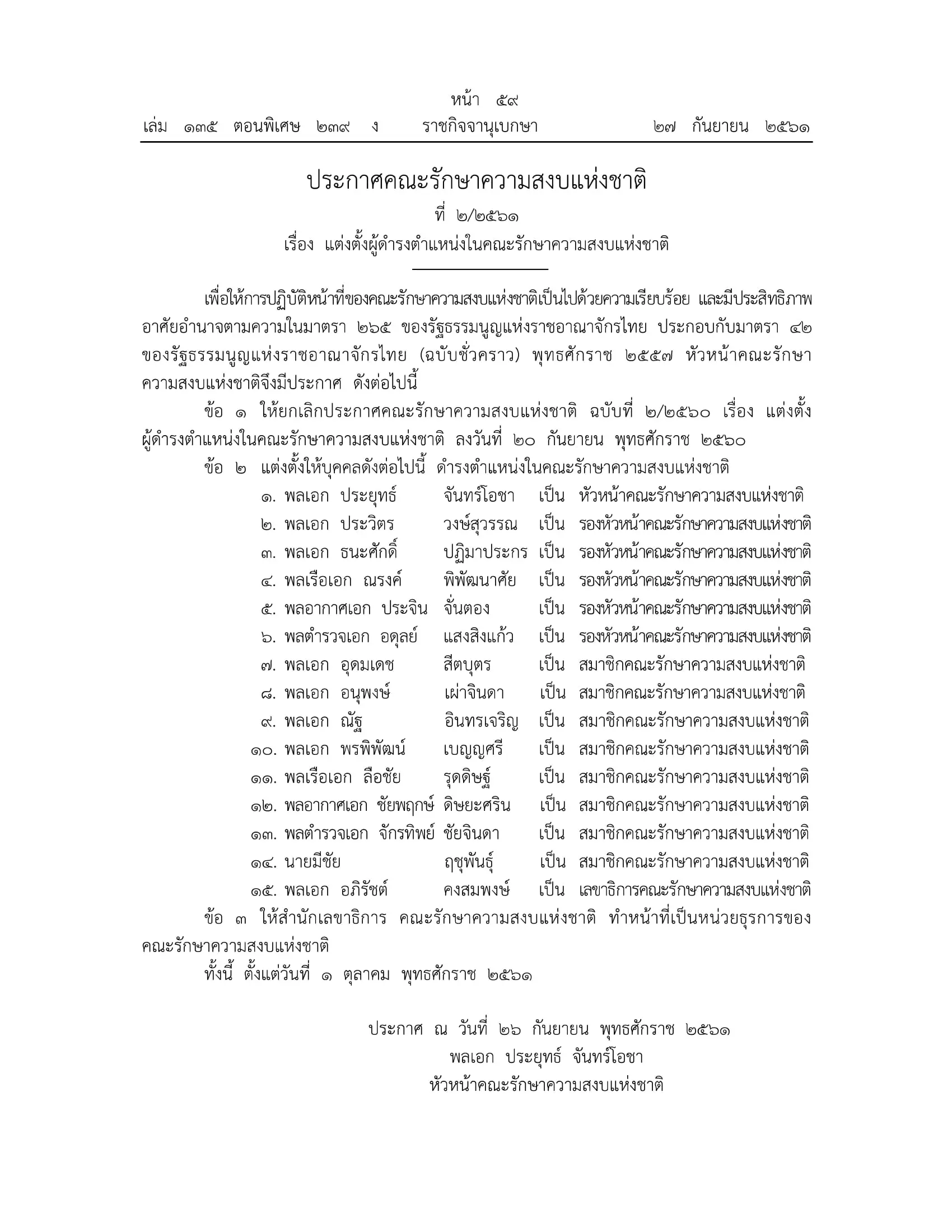 วันนี้ (27 ก.ย.) เว็บไซต์ราชกิจจานุเบกษา เผยแพร่ประกาศคณะรักษาความสงบแห่งชาติที่ 2/2561 เรื่อง แต่งตั้งผู้ดำรงตำแหน่งในคณะรักษาความสงบแห่งชาติ (คสช.) โดยให้แต่งตั้งให้บุคคลต่อไปนี้ดำรงตำแหน่งในคสช.