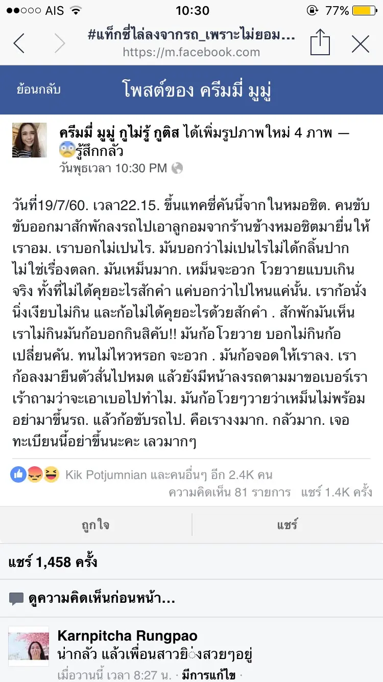 ผู้โดยสารรายนี้เล่าให้ทีมข่าวฟังว่า เมื่อวันที่ 19 ก.ค. ที่ผ่านมา เวลาประมาณ 22.00 น. เธอได้ขึ้นรถแท็กซี่สีชมพู ป้ายทะเบียน ทว7933 จากหมอชิตเพื่อไปย่านจรัญสนิทวงศ์ พอขับออกมาสักพัก จู่ๆคนขับก็ลงจากรถไปซื้อลูกอมที่ร้านค้าแถวหมอชิตมายื่นให้เธอ ซึ่งเธอก็ปฏิเสธไม่รับ ตอนนั้นก็ยังไม่ได้คิดอะไร ทางคนขับก็พูดขึ้นมาว่ากลิ่นปากไม่ใช่เรื่องตลก เหม็นมากจนอยากอาเจียน ซึ่งเธอก็บอกว่าพูดคุยกับคนขับเพียงแค่ตอนที่บอกว่าจะนั่งรถไปไหน อีกทั้งก็ไม่ได้นั่งหน้าคู่กับคนขับ จึงสงสัยว่าทำไมคนขับถึงพูดจาเกินจริงขนาดนั้น แต่ก็ไม่ได้ตอบโต้อะไรไป สักพักพอเห็นว่าเธอไม่ยอมกิน คนขับก็โวยวาย บอกว่าถ้าไม่ยอมกินก็ให้เปลี่ยนไปนั่งรถคันอื่น เพราะทนกับกลิ่นปากไม่ไหว จากนั้นก็วนรถมาจอดฝั่งตรงข้ามกับหมอชิตและเดินมาเปิดประตูให้เธอลง อีกทั้งได้เข้ามาขอเบอร์โทรศัพท์เธอ ซึ่งเธอไม่ให้เพราะไม่ทราบว่าจะเอาไปทำอะไร คนขับก็โวยวายเรื่องกลิ่นปากของเธออีกครั้งและบอกว่าหากไม่พร้อมก็อย่ามาขึ้นรถ จากนั้นก็รีบขับรถออกไป เธอจึงออกมาโพสต์ลงเฟซบุ๊กส่วนตัวเพื่อหวังจะเตือนภัยผู้โดยสารท่านอื่นๆให้ระวังรถแท็กซี่คันนี้ เพราะคนขับมีพฤติกรรมที่ไม่เหมาะสมกับผู้โดยสารและก็ได้ร้องเรียนไปยังกรมการขนส่งทางบกเรียบร้อยแล้ว