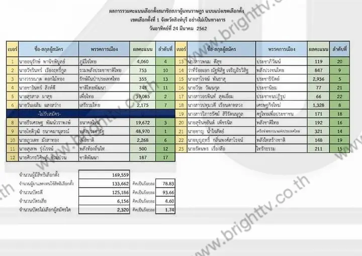 คะแนน กกต.จ.สิงห์บุรี นับแล้ว 100 % อย่างไม่เป็นทางการ