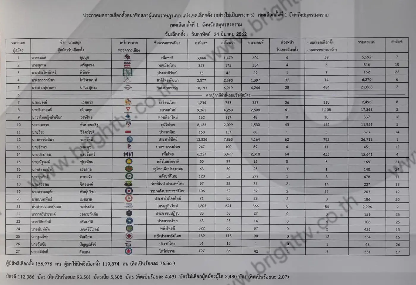 คะแนน กกต.จ.สมุทรสาคร นับแล้ว 100 % อย่างไม่เป็นทางการ