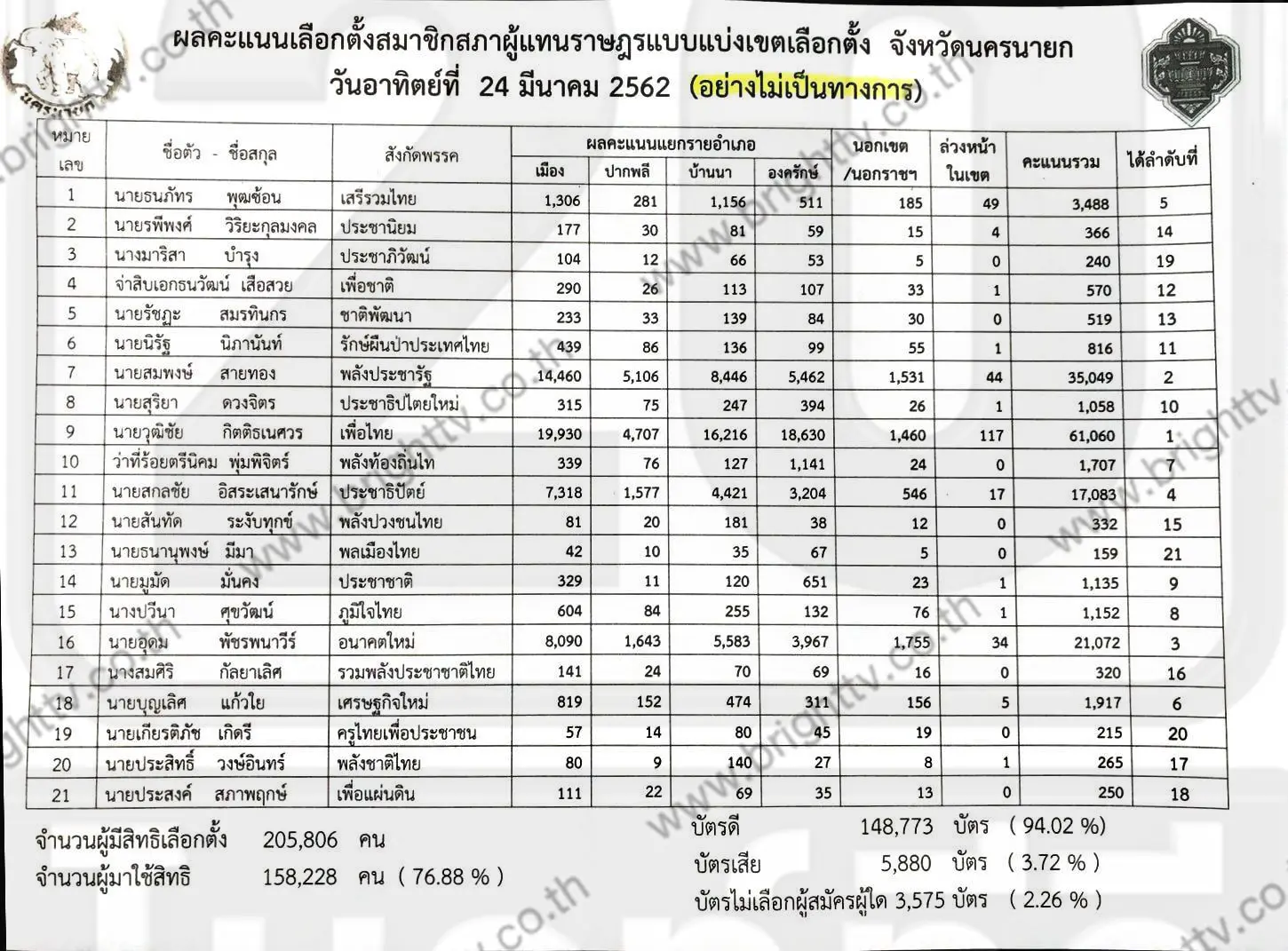 คะแนน กกต.จ.นครนายก นับแล้ว 100 % อย่างไม่เป็นทางการ