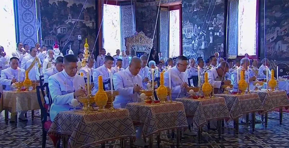 จากนั้นโหรหลวงจารึกดวงพระบรมราชสมภพ, ช่างศิลป์ประจำพระองค์ แกะพระราชลัญจกรประจำรัชกาล และเจ้าพนักงานอาลักษณ์จารึกพระสุพรรณบัฏ เข้าไปกราบพระพุทธมหามณีรัตนปฏิมากร ถวายบังคมพระราชอาสน์ 3 ครั้ง และคำนับผู้แทนพระองค์ แล้วไปนั่งเก้าอี้ที่จัดไว้ พระสงฆ์ 10 รูป ถวายพรพระ จบ