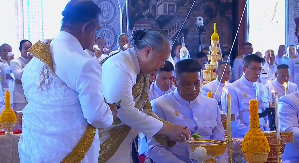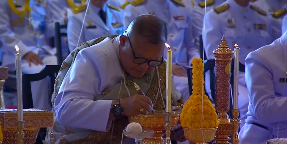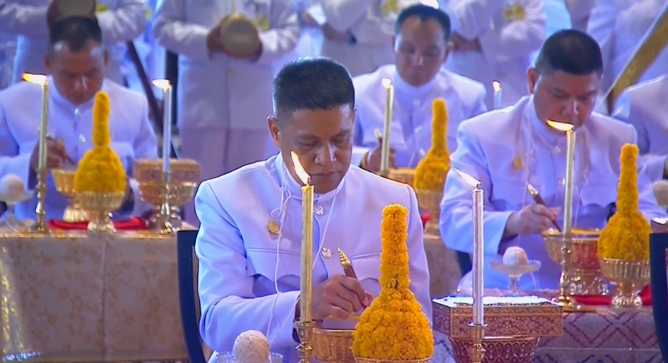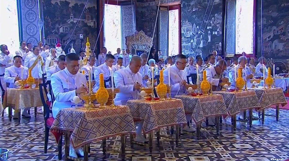 เมื่อเวลา 09.57 น.โหรหลวงจารึกดวงพระบรมราชสมภพ ช่างศิลป์ประจำพระองค์แกะพระราชลัญจกรประจำรัชกาล เจ้าพนักงานอาลักษณ์จารึกพระสุพรรณบัฎ เรียบร้อยแล้ว นำสายสิญจน์คล้องคอออก พระมหาราชครูพิธีศรีวิสุทธิคุณ ประธานพระครูพราหมณ์ ถวายน้ำเทพมนตร์ เจิมดวงพระบรมราชสมภพ พระราชลัญจกรประจำรัชกาล และพระสุพรรณบัฏ เสร็จแล้ว