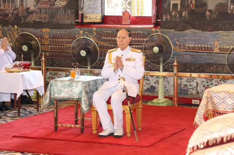 ขณะที่พระมหาราชครูพิธีศรีวิสุทธิคุณ ประธานพระครูพราหมณ์ เจิมดวงพระบรมราชสมภพ พระราชลัญจกรประจำรัชกาล และพระสุบรรณบัฏ ที่ประดิษฐานบนธรรมาสน์ศิลา ผู้แทนพระองค์เสด็จไปทรงกราบที่หน้าเครื่องนมัสการ ถวายความเคารพพระราชอาสน์ แล้วเสด็จกลับ
