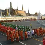 เวลา 16.30 น. รถยนต์พระที่นั่งเทียบที่ประตูกำแพงแก้วพระที่นั่งดุสิตมหาปราสาท ประทับพระราชยานพุดตานทอง เสด็จออกจากเกยพระที่นั่งอาภรณ์พิโมกข์ปราสาท ชาวพนักงานประโคมมโหระทึก แตร ทหารกองเกียรติยศ 3 เหล่าทัพ ถวายความเคารพ วงดุริยางค์บรรเลงเพลงสรรเสริญพระบารมี ทหารบก ทหารเรือ และทหารอากาศ ยิงปืนใหญ่เฉลิมพระเกียรติฝ่ายละ 21 นัด พระบาทสมเด็จพระเจ้าอยู่หัว เสด็จฯ โดยขบวนพยุหยาตราทางสถลมารคตามโบราณราชประเพณี มีกองทหารแห่นำริ้วขบวนพระราชอิสริยยศออกจากพระบรมมหาราชวังทางประตูวิเศษไชยศรีไปยังวัดบวรนิเวศวิหาร