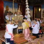 สมเด็จพระนางเจ้าฯ พระบรมราชินีเสด็จฯ ไปประทับพระราชอาสน์เบื้องซ้ายพระที่นั่งภัทรบิฐ พระบาทสมเด็จพระเจ้าอยู่หัวทรงเปลื้องพระมหาพิชัยมงกุฎ และพระธำมรงค์ พระราชทานผู้เชิญรับเชิญไว้ ทรงโปรยดอกพิกุลทอง พิกุลเงิน พระราชทานแก่พราหมณ์แล้วพระมหาราชครูพิธีศรีวิสุทธิคุณ ประธานพระครูพราหมณ์ถอดฉลองพระบาทเชิงงอนเสด็จพระราชดำเนินออกจากพระที่นั่งอมรินทรวินิจฉัย ทางพระทวารเทวราชมเหศวร สมเด็จพระวันรัต วัดบวรนิเวศวิหาร ดับเทียนชัย พระสงฆ์ทั้งนั้น เจริญคาถา ดับเทียนชัย ทรงประเคนจตุปัจจัยไทยธรรมแด่พระสงฆ์ 80 รูป ในการพระราชพิธีนี้ทรงหลั่งทักษิโณทก พระสงฆ์ถวายอนุโมทนา ถวายอดิเรก ถวายพระพรลาออกจากพระที่นั่งแล้ว พระบาทสมเด็จพระเจ้าอยู่หัวและสมเด็จพระนางเจ้าฯ พระบรมราชินี เสด็จฯ ไปประทับพักพระราชอิริยาบถ ณ พระที่นั่งจักรพรรดิพิมาน
