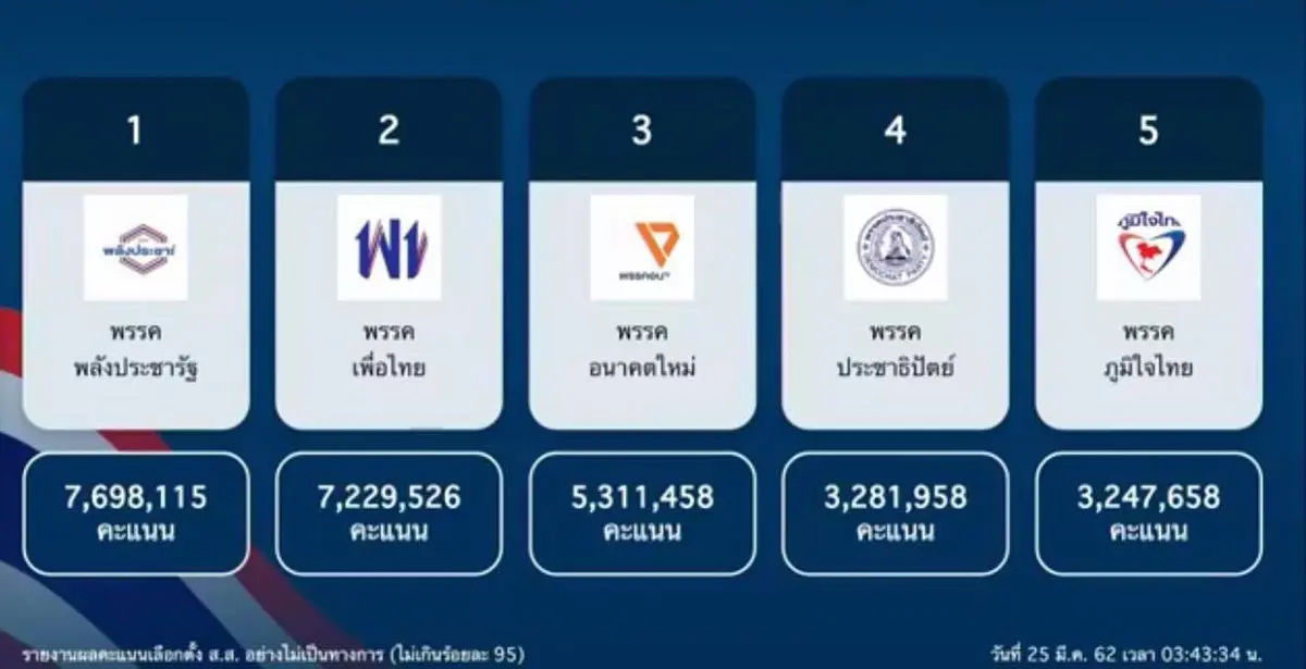 25 มี.ค. 2562 ผลการนับคะแนนการเลือกตั้งสมาชิกสภาผู้แทนราษฎร (ส.ส.) อย่างไม่เป็นทางการ จากสำนักงานคณะกรรมการการเลือกตั้ง (กกต.) เมื่อเวลาประมาณ 03.43 น. อยู่ที่ร้อยละ 94 ของการนับคะแนนทั่วประเทศ