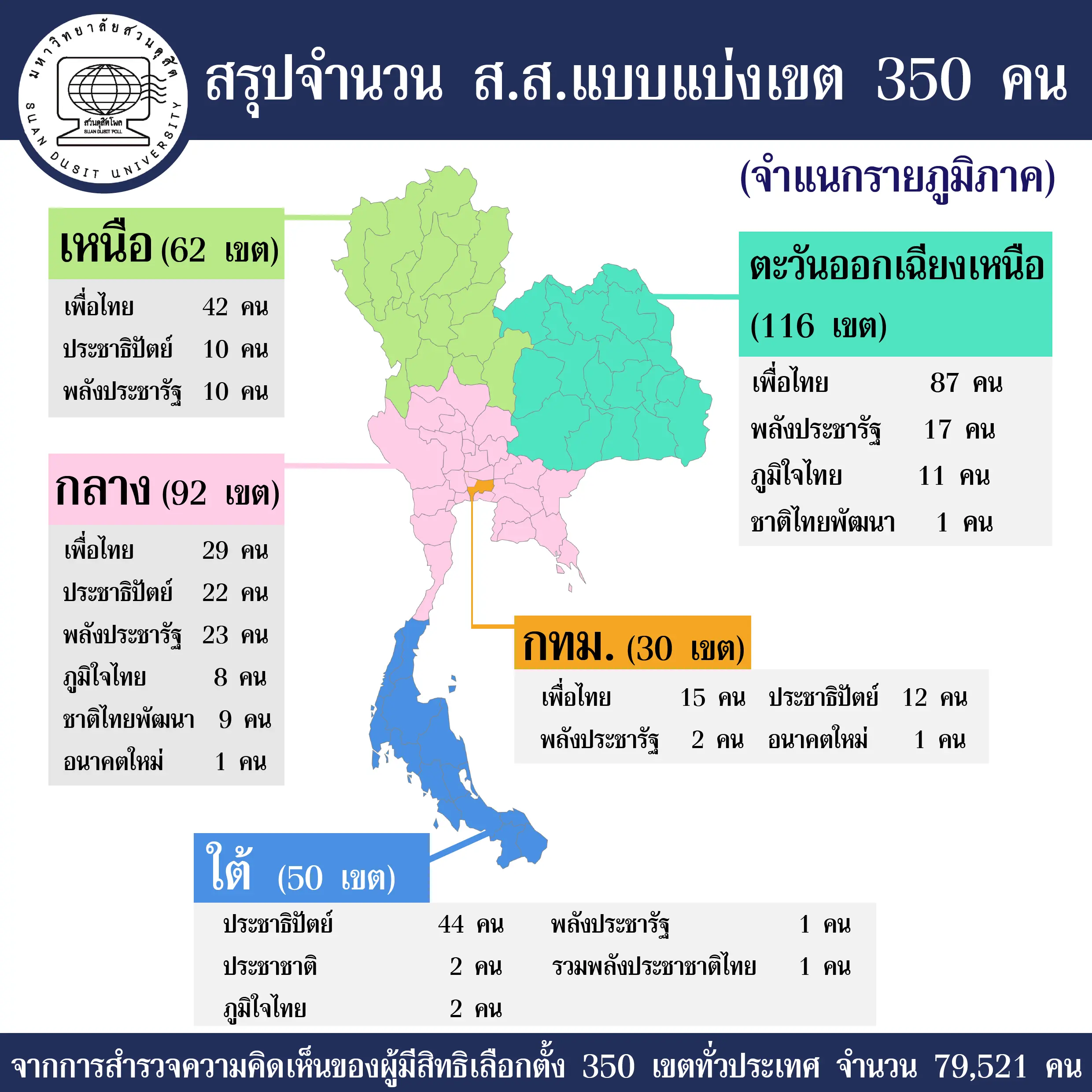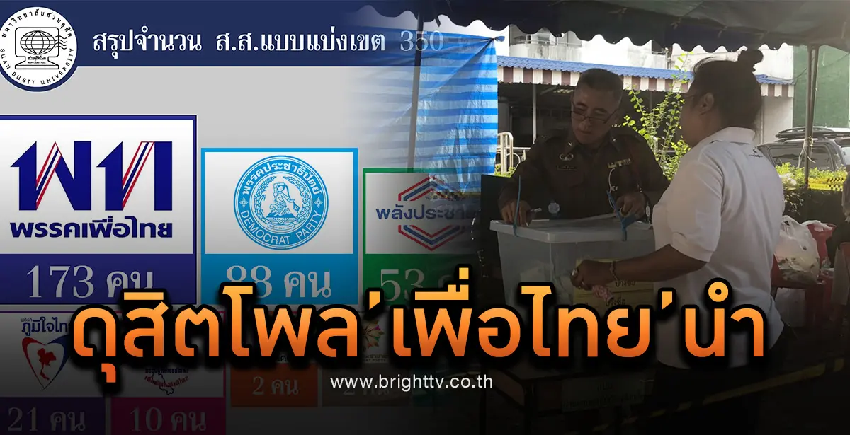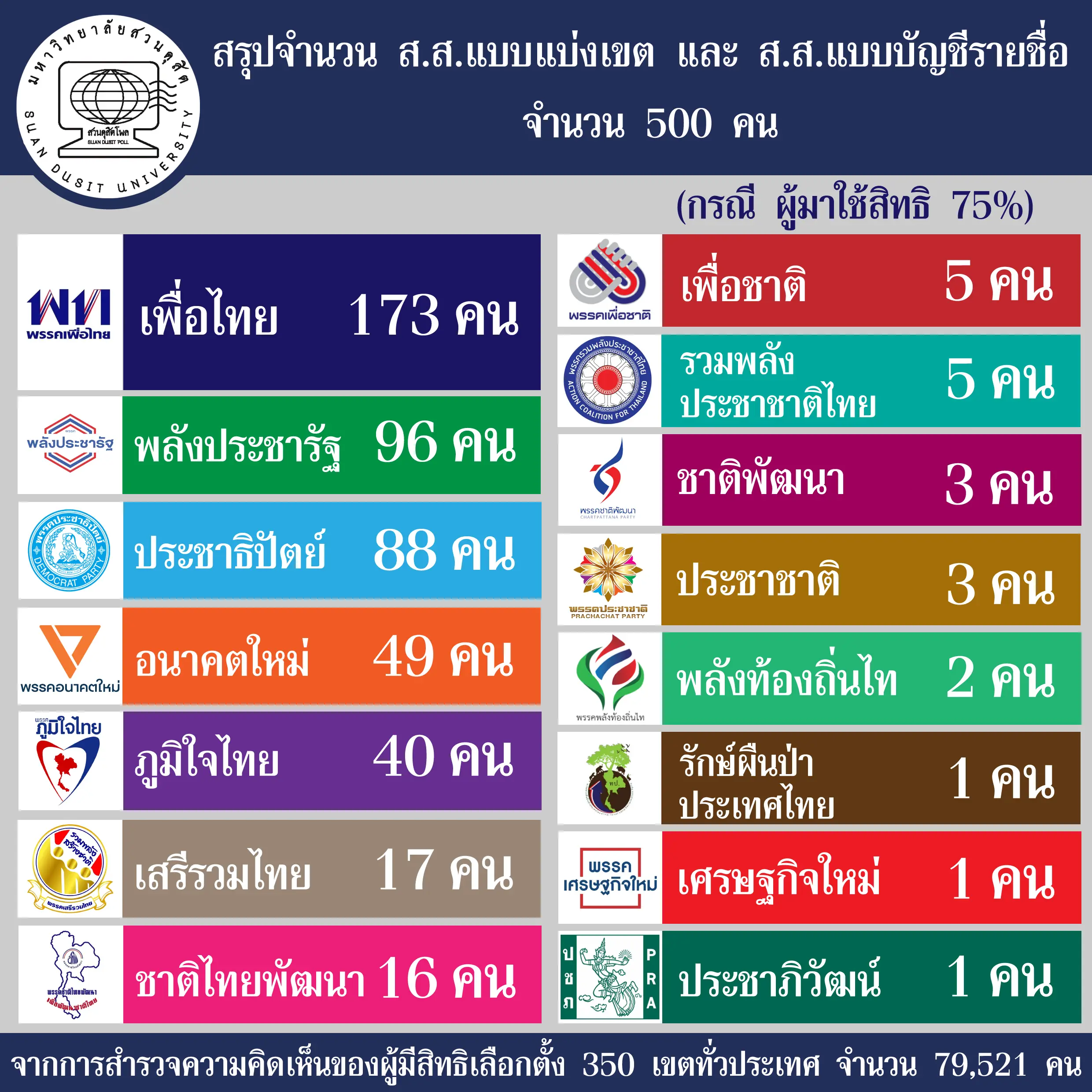 ผลการสำรวจความคิดเห็น Exit Poll ของสวนดุสิตโพล สรุปจำนวน ส.ส.แบบแบ่งเขต จากผู้มีสิทธิเลือกตั้ง 350 เขตทั่วประเทศ จำนวน 79,521 คน พรรคเพื่อไทย ได้ ส.ส.จำนวน 173 ที่นั่ง พรรคประชาธิปัตย์ ได้ ส.ส. 88 ที่นั่ง ขณะที่พรรคพลังประชารัฐ ได้ ส.ส. 53 ที่นั่ง