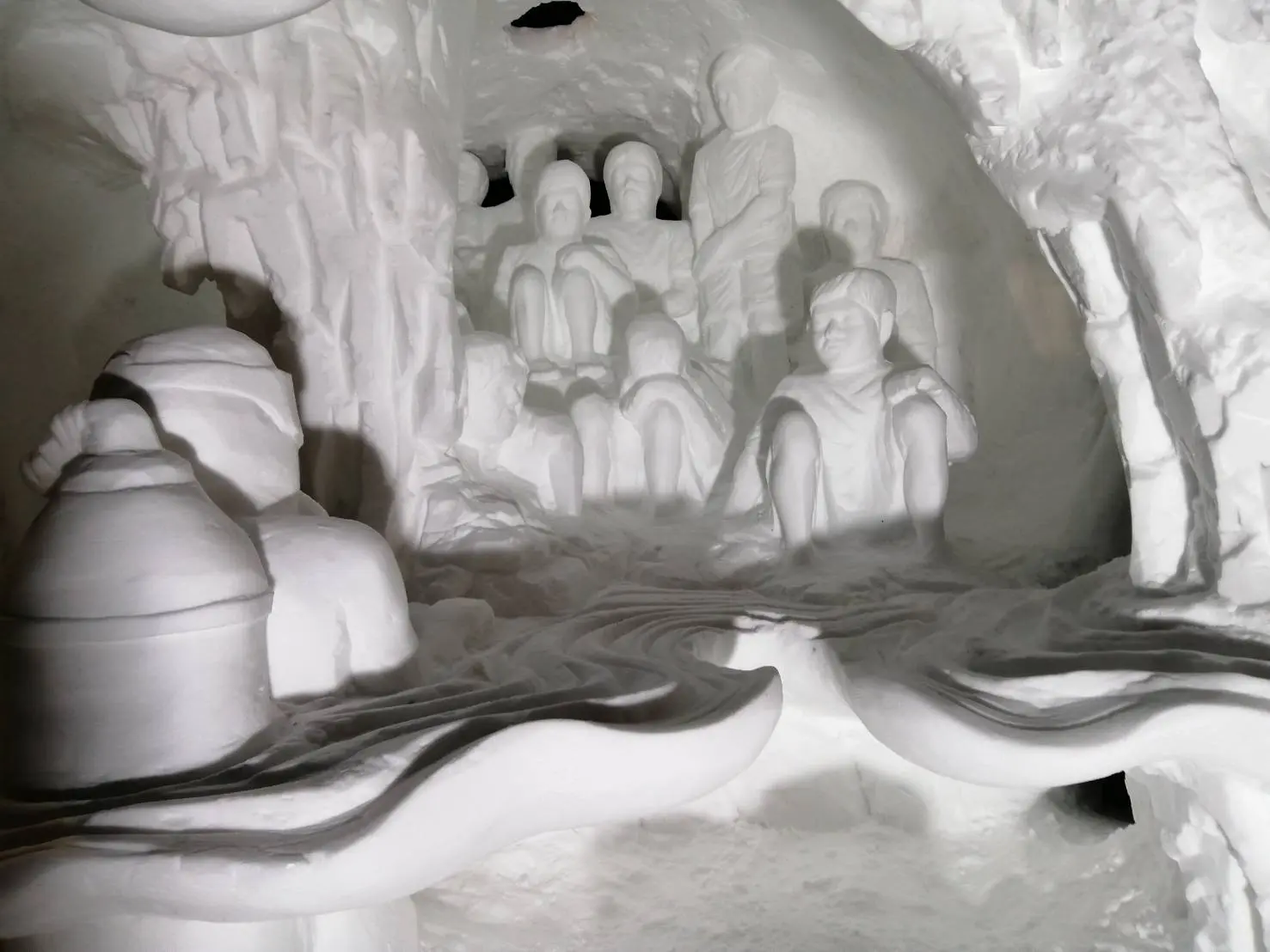 “ลายกนกที่เราทำเสริมนั้น ต้องต่อจากยอดขึ้นไปไม่ให้ล้ม วิธีการของเราคือนำหิมะมาขูดให้เป็นขุยละเอียดเพื่อเชื่อมชิ้นงานเข้าด้วยกันได้อย่างแข็งแรงและไม่หักลงมา แต่พอเรามีลายกนกอยู่ด้านบนแล้วต้องแกะสลักหิมะเป็นโพรงถ้ำ ก็มีความเป็นไปได้ที่ถ้ำจะถล่มลงมาได้ เราจึงต้องปรับแบบให้ในถ้ำมีเสาหินย้อยลงมาตรงตำแหน่งเดียวกับยอดกนกเพื่อน้ำหนักเพิ่มความแข็งแรง ซึ่งตามธรรมชาติของถ้ำหลวงก็มีหินย้อยเช่นเดียวกัน”ธวัชชัยกล่าว