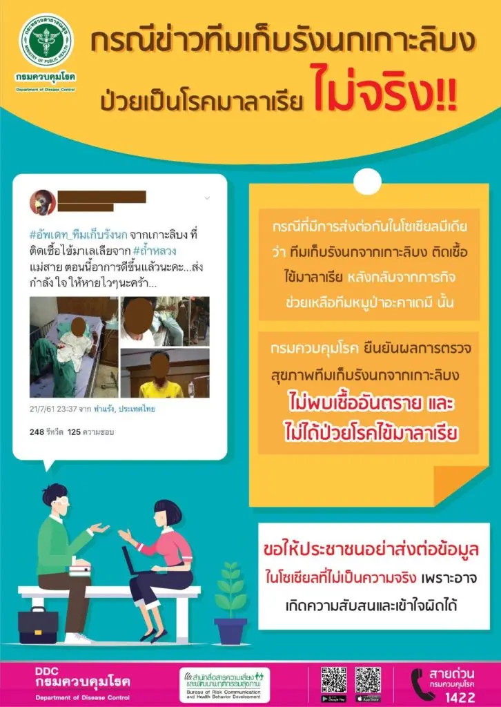 จากการแชร์ข่าวในโซเชียลมีเดียว่า ทีมเก็บรังนกจากเกาะลิบง ป่วยเป็นไข้มาลาเรีย หลังกลับจากภารกิจช่วยตามหาทีมหมูป่าที่ถ้ำหลวงนั้น ล่าสุด กรมควบคุมโรค ยืนยันไม่พบว่ามีการแพร่เชื้อ ขอความร่วมมือประชาชน อย่าแชร์ข้อมูลที่ไม่เป็นความจริง สร้างความสับสนและเข้าใจผิด