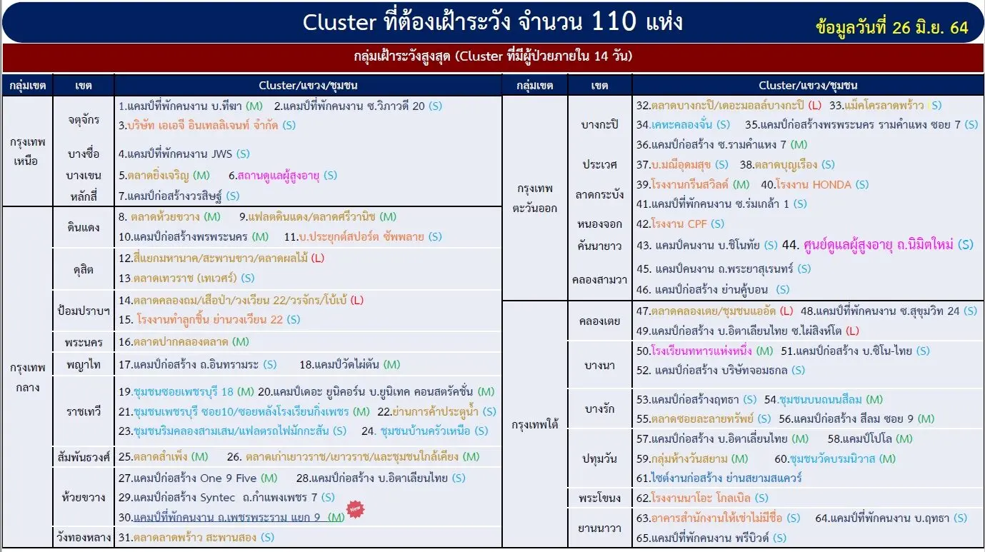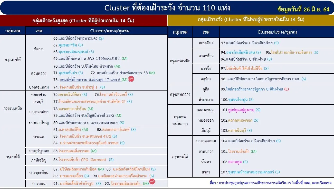 คลัสเตอร์ — เมื่อวันที่ 26 มิ.ย. 2564 ศูนย์บริหารสถานการณ์การแพร่ระบาดของโรคติดเชื้อไวรัสโคโรนา 2019 (โควิด-19) (ศบค.) ได้เปิดเผย คลัสเตอร์ ที่ต้องเฝ้าระวังจำนวน 110 แห่ง ในกรุงเทพฯ โดยแบ่งเป็น