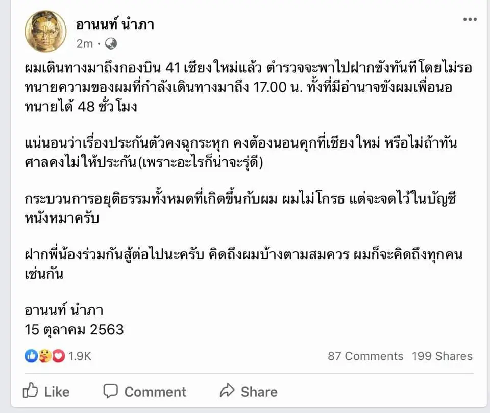 วันที่ 15 ต.ค. 63 ทนาย อานนท์ นำภา โพสต์ข้อความผ่านเฟซบุ๊ก อานนท์ นำภา ก่อนที่บัญชีดังกล่าวจะหายไป ระบุว่า ผมเดินทางมาถึงกองบิน 41 เชียงใหม่แล้ว ตำรวจจะพาไปฝากขังทันทีโดยไม่รอทนายความของผมที่กำลังเดินทางมาถึง 17.00 น. ทั้งที่มีอำนาจขังผมเพื่อรอทนายได้ 48 ชั่วโมง