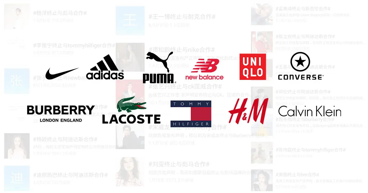 - ยุติสัญญากับ Adidas – หลิวอี้เฟย, หยางมี่ , ตี๋มี่เร่อปา, เฉินอี้ซวิ่น (Eason Chan),Angelababy, แจ็คสัน หวัง GOT7, เฉินหลี่หนง, เอดดี้ เผิง, จ้าวลูซือ, ติงอวี่ซี
