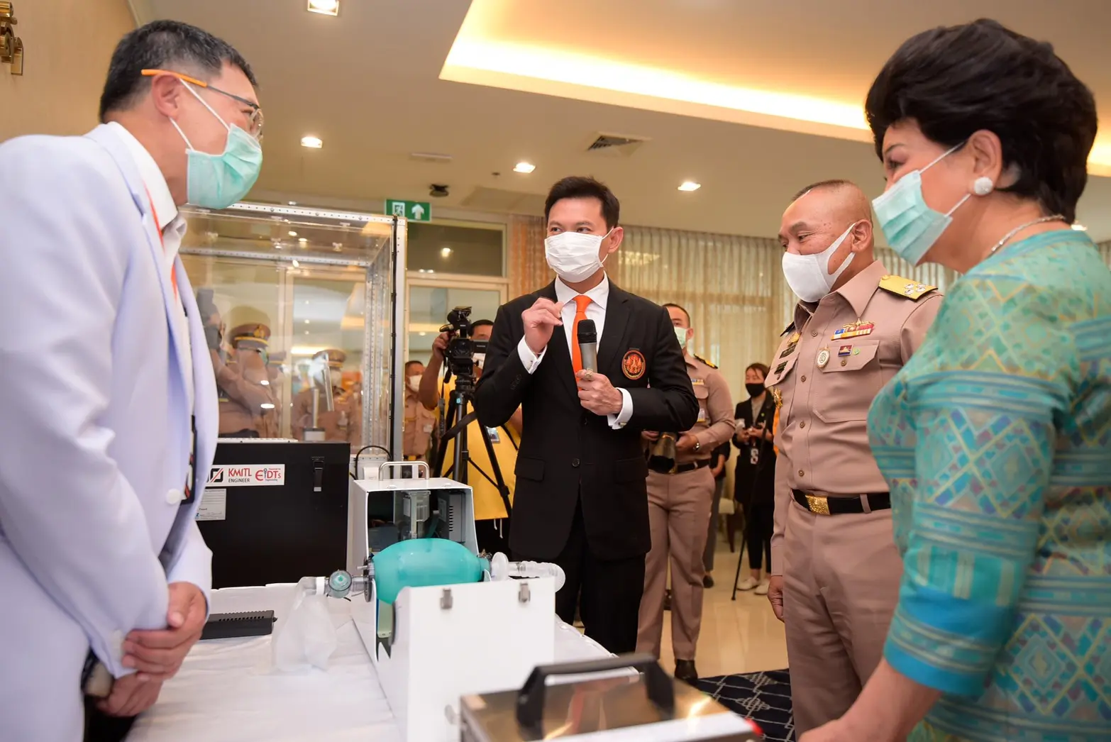 “สจล.มีเกณฑ์ในการส่งมอบนวัตกรรม ได้แก่ เป็นโรงพยาบาลภายใต้การกำกับของรัฐ โรงพยาบาลที่แต่งตั้งเป็นศูนย์โควิด-19 ศูนย์คัดกรองโควิด-19 หรือมีผู้ป่วยที่เฝ้าระวังและสอบสวนโรค เป็นโรงพยาบาลที่อยู่ติดชายแดน และมีหนังสือขอความอนุเคราะห์มาจากหน่วยงานหรือกระทรวงสาธารณสุข ซึ่งนวัตกรรมต่าง ๆ ได้รับการพัฒนาขึ้นมา โดยคณาอาจารย์ นักศึกษา และทีมวิจัยสจล. ซึ่งได้รับการทดสอบจากศูนย์ทดสอบผลิตภัณฑ์ไฟฟ้าและอิเล็กทรอนิกส์ หรือ PTEC ตามมาตรฐาน IEC 60601-1 ด้านความปลอดภัย เพื่อนำไปใช้เสริมทีมบุคลากรทางการแพทย์ในการรองรับประชาชน ซึ่งหนึ่งในปัจจัยสำคัญที่ทำให้ก้าวผ่านจุดวิกฤติมาได้ นั่นก็คือความสามารถและความรวดเร็วในการปรับตัวของบุคลากรทางการแพทย์ เพื่อรองรับผู้ป่วยในโรงพยาบาลต่าง ๆ ดังนั้น สจล. จึงมีความตั้งใจที่จะพัฒนานวัตกรรมที่มีประสิทธิภาพและตอบสนองความต้องการโดยเฉพาะในสถานการณ์การแพร่ระบาดโควิด-19 โดยนวัตกรรมที่ได้ผลิตและส่งมอบให้กับโรงพยาบาลสมเด็จพระปิ่นเกล้าในครั้งนี้ จำนวน 6 นวัตกรรมได้แก่ เครื่องช่วยหายใจแบบฉุกเฉินยาดเล็ก เครื่องฆ่าเชื้อโรคด้วยโอโซน ระบบคัดกรองบุคคลด้วยAI ตู้ตรวจเชื้อ (Swab Test) ความดันบวก (Positive Pressure) ตู้ตรวจเชื้อ (Swab Test) ความดันลบ (Negative Pressure)และชุดหมวกป้องกันบุคลากรทางการแพทย์ (PAPRs)”อธิการบดี สจล.กล่าว