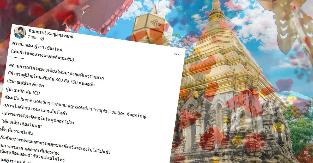 เมื่อวันที่ 28 ตุลาคม 2564 ทางด้านของนพ.รังสฤษฎ์ กาญจนะวณิชย์ หรือ หมอหม่อง อาจารย์แพทย์โรคหัวใจ ภาควิชาอายุรศาสตร์ คณะแพทยศาสตร์ มหาวิทยาลัยเชียงใหม่ โพสต์ข้อความผ่านทางเฟซบุ๊กส่วนตัว Rungsrit Kanjanavanit ถึงสถานการณ์แพร่ระบาดของเชื้อโควิด-19 ในจังหวัดเชียงใหม่ ที่นับวันยอดผู้ติดเชื้อเพิ่มขึ้นหลักร้อยต่อวัน โดยโพสต์ดังกล่าวได้ระบุว่า