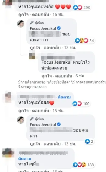 ทั้งนี้ก็ได้มีเหล่าแฟนๆเข้ามาคอมเมนต์ให้กำลังใจโฟกัสกันเป็นจำนวนมาก พร้อมให้กำลังใจขอให้เธอหายไวๆ