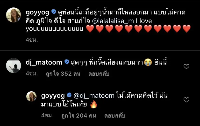 เมื่อเวลา 11 โมงตรง MV – LALISA ของเธอถูกปล่อยออกมา กระแสตอบรับในโซเชียลก็แทบลุกเป็นไฟ ! โดยเหล่าคนบันเทิงไทยต่างออกมารีแอคหลังชม MV กันเป็นจำนวนมาก รวมถึง ก้อย อรัชพร ที่ได้มีการโพสต์ส่วนหนึ่งในคลิป MV – LALISA พร้อมระบุข้อความว่า ดูท่อนนี้ละก็อยู่ๆน้ำตาก็ไหลออกมา แบบไม่คาดคิด ภูมิใจ ดีใจ สาแก่ใจ @lalalalisa_m I love youuuuuuuuuuuuu ❤️❤️❤️❤️❤️❤️❤️❤️❤️❤️❤️