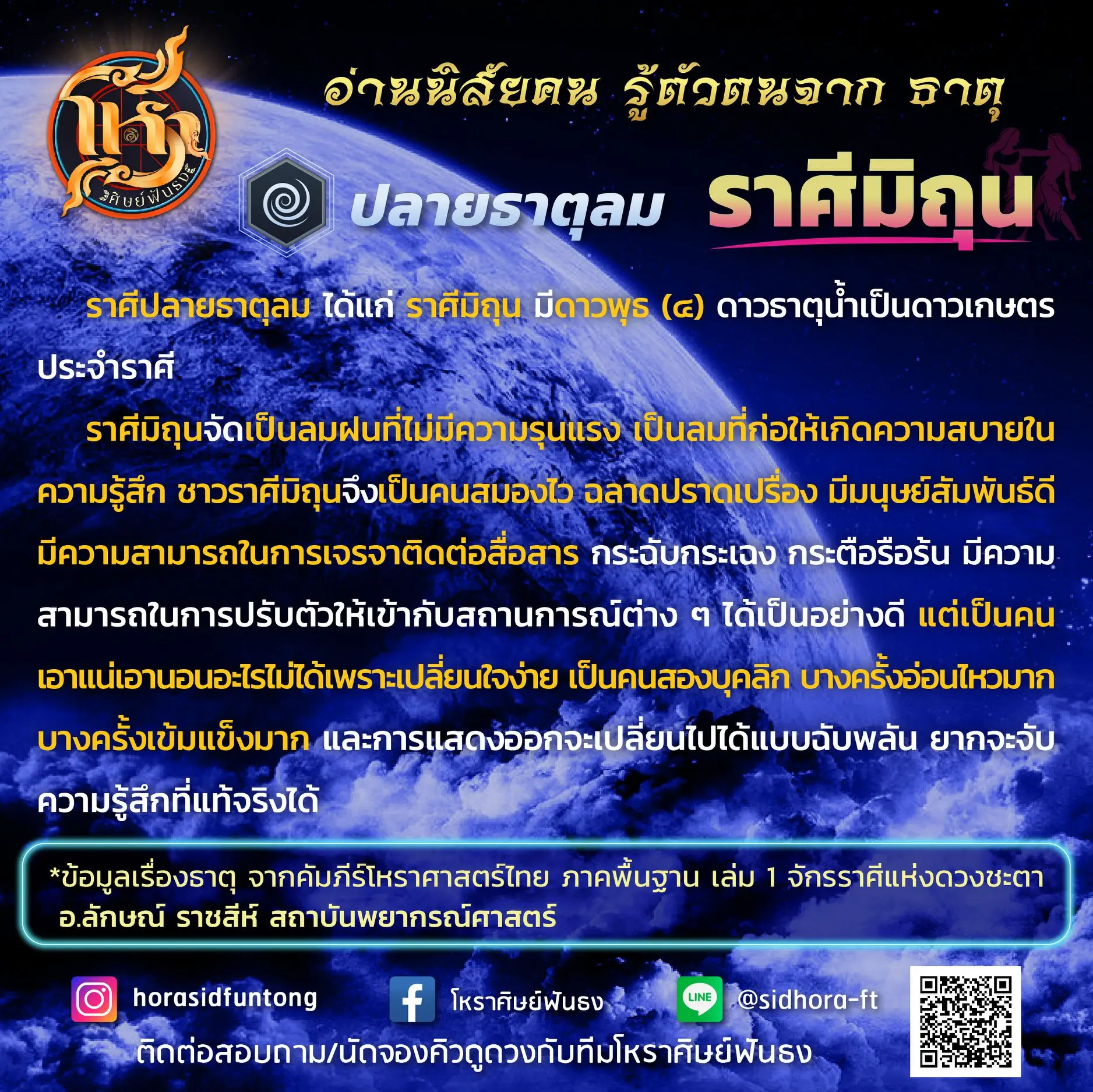 เพจโหราศิษย์ฟันธง ได้โพสต์ภาพและข้อความถึงคำทำนายนิสัยจากปลายธาตุลม ราศีมิถุน ว่า “สวัสดีค่ะ วันนี้เรามาทำความรู้จักกับลักษณะนิสัยของราศีปลายธาตุลมกัน ซึ่งเป็นธาตุสุดท้ายแล้วนะคะ ใครที่ยังไม่ได้อ่านธาตุก่อนหน้า สามารถย้อนไปอ่านได้ในโพสต์ที่ผ่าน ๆ มานะคะ ขอบคุณที่ติดตามอ่านค่ะหวังว่าจะช่วยให้ทุกคนเข้าใจลักษณะนิสัยของคนตามธาตุต่าง ๆ มากยิ่งขึ้นค่ะ”