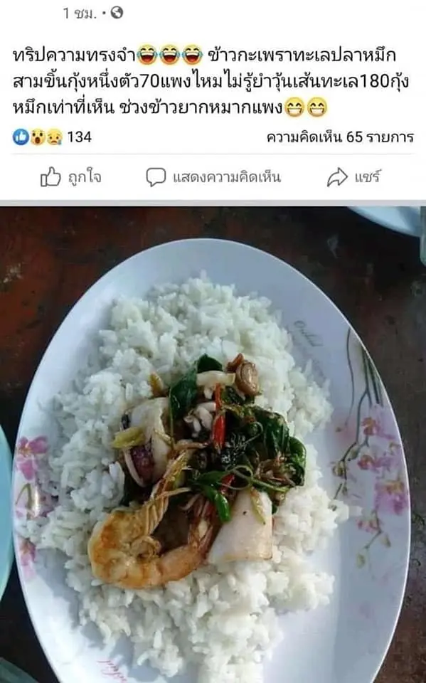 จากกรณีผู้ใช้เฟซบุ๊กรายหนึ่งได้โพสต์ภาพอาหาร 2 จาน โดยมีกะเพราทะเลปลาหมึก กับ ยำวุ้นเส้น พร้อมระบุว่า กะเพราทะเลปลาหมึก สามชิ้นกุ้งหนึ่งตัว 70 แพงไหมไม่รู้ ยำวุ้นเส้นทะเล 180 กุ้งหมึกเท่าที่เห็น โดยโพสต์ดังกล่าวกลายเป็นกระแสวิพากษ์วิจารณ์เป็นอย่างมาก ถึงปริมาณและราคาว่าสมเหตุสมผลกันหรือไม่