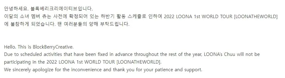 ต้นสังกัดของ LOONA ได้ประกาศว่า ชยู (Chuu) จะไม่เข้าร่วมเวิร์ลทัวร์ของวงที่กำลังจะมีขึ้นในเดือนสิงหาคมที่จะถึงนี้