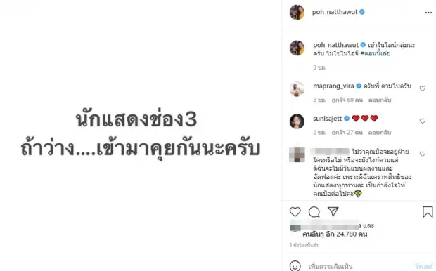 แต่ล่าสุด หนุ่มป๋อ โพสต์ข้อความว่า “นักแสดงช่อง 3 ถ้าว่าง…เข้ามาคุยกันนะครับ” พร้อมแคปชั่น ….เข้าในไลน์กลุ่มนะครับ ไม่ใช่ในไอจี #ตอนนี้เล้ย…. ซึ่งงานนี้จะเกี่ยวกับโปรเจ็คใหม่ๆ หรือพ่อเหงาหาเพื่อนคุยอะไรยังไง หลังจากที่เจ้าตัวโพสต์ไปก็ต้องบอกว่าแฟนๆคอมเมนต์อยากเข้าเป็นเป็นส่วนหนึ่งเลยทันที เรียกว่าโพสต์สาธารณะขนาดนี้ ต้องมีอะไรให้ลุ้นกันอย่างแน่นอน