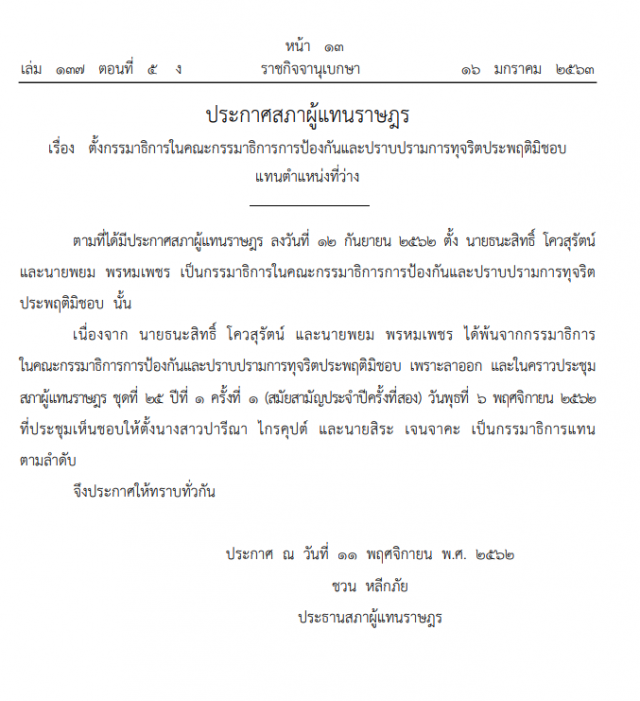 เนื่องจาก นายธนะสิทธิ์ โควสุรัตน์ และนายพยม พรหมเพชร ได้พ้นจากกรรมาธิการในคณะกรรมาธิการการป้องกันและปราบปรามการทุจริตประพฤติมิชอบ เพราะลาออก และในคราวประชุมสภาผู้แทนราษฎร ชุดที่ ๒๕ ปีที่ ๑ ครั้งที่ ๑ (สมัยสามัญประจําปีครั้งที่สอง) วันพุธที่ ๖ พฤศจิกายน ๒๕๖๒ที่ประชุมเห็นชอบให้ตั้ง นางสาวปารีณา ไกรคุปต์ และนายสิระ เจนจาคะ เป็นกรรมาธิการแทนตามลําดับ