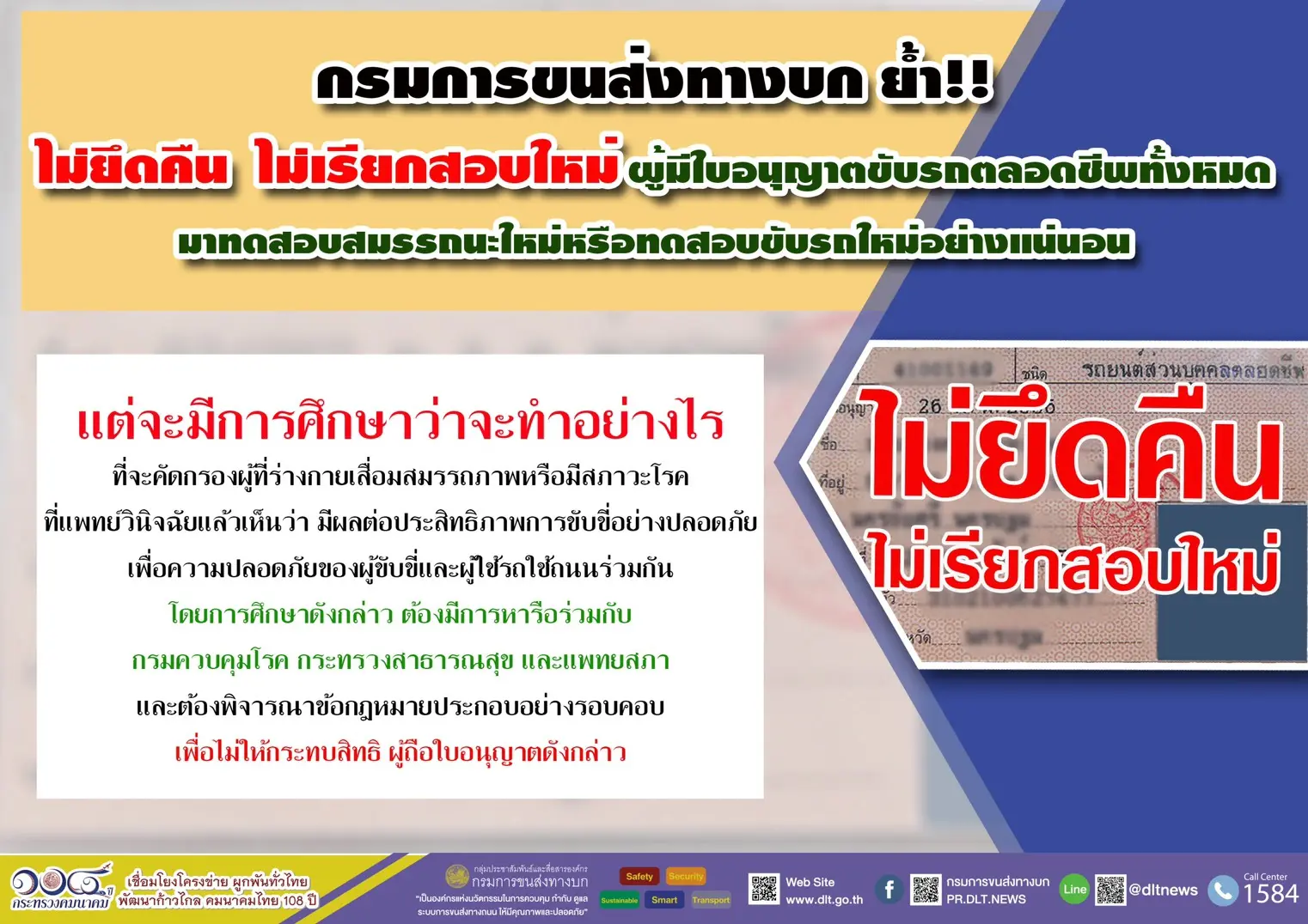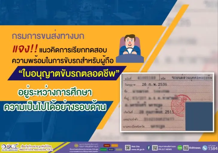 กรมขนส่งทางบก ยืนยัน ไม่ยึดคืน ใบขับขี่ตลอดชีพ จากส่วนใหญ่ที่เป็นผู้สูงอายุ ชี้แจงแค่แนวคิดเท่านั้น หลังชาวเน็ตแชร์ข่าวว่อนโลกออนไลน์