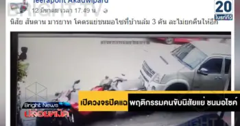 โลกออนไลน์ได้มีการเผยแผร่คลิปพฤติกรรมของคนขับรถยนต์ อีซูซุ มิวเซเว่น สีขาว รายหนึ่ง ได้ขับรถชนรถจยย.ที่จอดอยู่ริมถนนจนล้มไปกองกับพื้น 3 คันรวดแต่คนขับรถคันดังกล่าวกลับไม่ยอมลงมาดูรถจยย. ก่อนจะขับรถอออกไปอย่างหน้าตาเฉย โดยผู้ใช่เฟซบุ๊ก Teerapoht Akadwipard ลั่นข้อความ นิสัย สันดาร มารยาท โคตรแย่