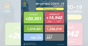 รายงานตัวเลขผู้ติดเชื้อ โควิดวันนี้ (4ก.ย.64) ติดเชื้อรายใหม่ 15,942 ราย รวบสะสมกว่า 1,236,219 ราย ตายเพิ่มอีก 257 ราย และกำลังรักษาอีก 155,134