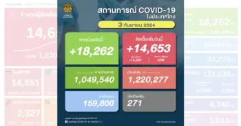 สถานการณ์ตัวเลขโควิดวันนี้ (3ก.ย.64) ยอดตายยังสูง 271 ราย ติดเชื้อรายใหม่ 14,653 ราย ส่งผลยอดติดเชื้อสะสม 1,220,277 ราย และกำลังรักษาอีก 159,800 ราย