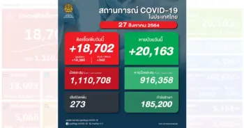โควิดวันนี้ 27 สิงหาคม 2564 ยอดเสียชีวิตสะสมทะลุหมื่นราย นับตั้งแต่ระลอกการระบาดเดือนเมษายน 64 – ติดเชื้อเพิ่ม 18,702 ราย ตาย 273 ราย