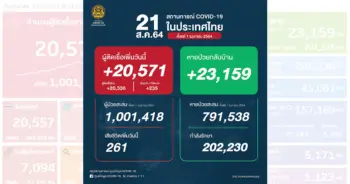 โควิดวันนี้! ผู้ป่วยสะสมทะลุล้าน 1,001,418 ราย ติดเชื้อเพิ่ม 20,571 ราย ยอดผู้เสียชีวิตยังพุ่งสูงถึง 261 ราย และหายป่วยสามารถกลับบ้านได้ 23,159 ราย