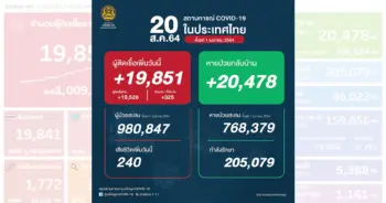 ควิดวันนี้ — เมื่อวันที่ 19 สิงหาคม 2564 ศูนย์ข้อมูล COVID-19 รายงานยอดผู้ติดเชื้อ โควิด-19 โดยพบผู้ติดเชื้อรายใหม่เพิ่ม 20,754 ราย
