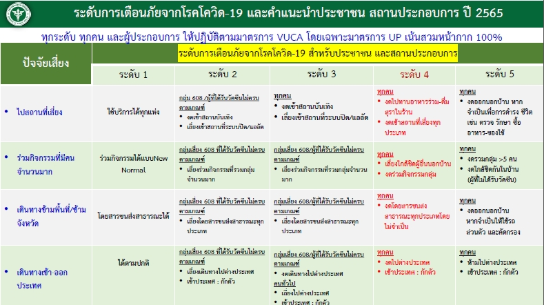 นพ.โอภาสกล่าวว่า สำหรับการประกาศแจ้งเตือนภัยโควิดระดับ 4 เพื่อขอความร่วมมือ คือ 1.งดไปสถานที่เสี่ยงที่ระบบระบายอากาศไม่ดี แออัด ไม่ใส่หน้ากาก งดรับประทานอาหารและดื่มสุราในร้าน 2.หลีกเลี่ยงกิจกรรมรวมตัวจำนวนมาก 3.เดินทางข้ามจังหวัดเท่าที่จำเป็น ขอให้งดโดยสารขนส่งสาธารณะทุกประเภท แต่หากมีความจำเป็นขอให้ระมัดระวัง ซึ่งขนส่งสาธารณะมีมาตรการเข้มงวด ทั้งใส่หน้ากาก ตรวจ ATK กรณีใช้เวลาโดยสารนาน และ 4.งดเดินทางไปต่างประเทศ เนื่องจากต่างประเทศมีการระบาดสูง และผู้เดินทางกลับมาติดเชื้อจำนวนมาก และช่วงนี้ขอให้ป้องกันตนเองด้วย VUCA ส่วนมาตรการทางกฎหมาย เช่น การปรับพื้นที่สี หรือการปิดสถานที่ต่างๆ ศบค.จะมีการประชุมเพื่อปรับมาตรการวันที่ 7 มกราคม 2565 ต่อไป