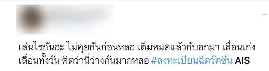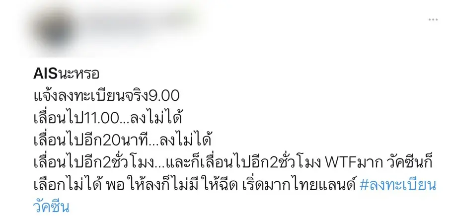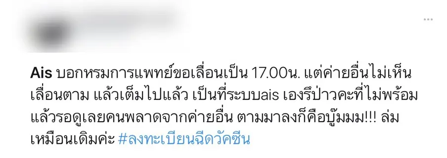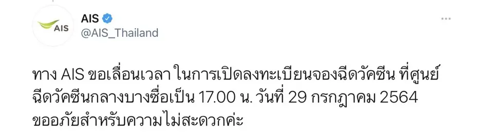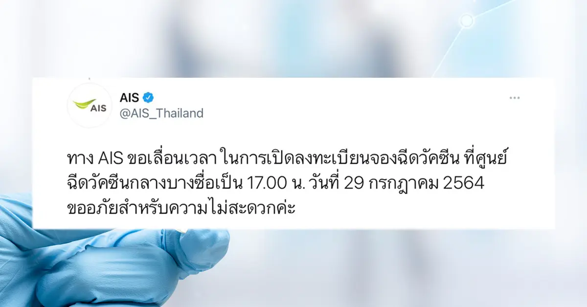 เลื่อนอีกแล้ว! AIS เลื่อนลงทะเบียนฉีดวัคซีน จากเวลาเดิม 13.00 น. เป็น 17.00 น. ก่อนเจอชาวเน็ตลั่นเล่นอะไรกันอยู่? วันนี้จะได้ลงทะเบียนหรือไม่?