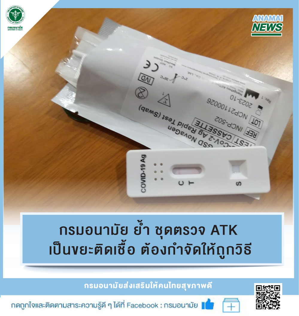 กรมอนามัย กระทรวงสาธารณสุข ย้ำประชาชนที่ใช้ชุดตรวจ ATKเป็นขยะติดเชื้อ ต้องกำจัดอย่างถูกวิธี เนื่องจากเสี่ยงต่อการแพร่กระจายเชื้อโควิด-19