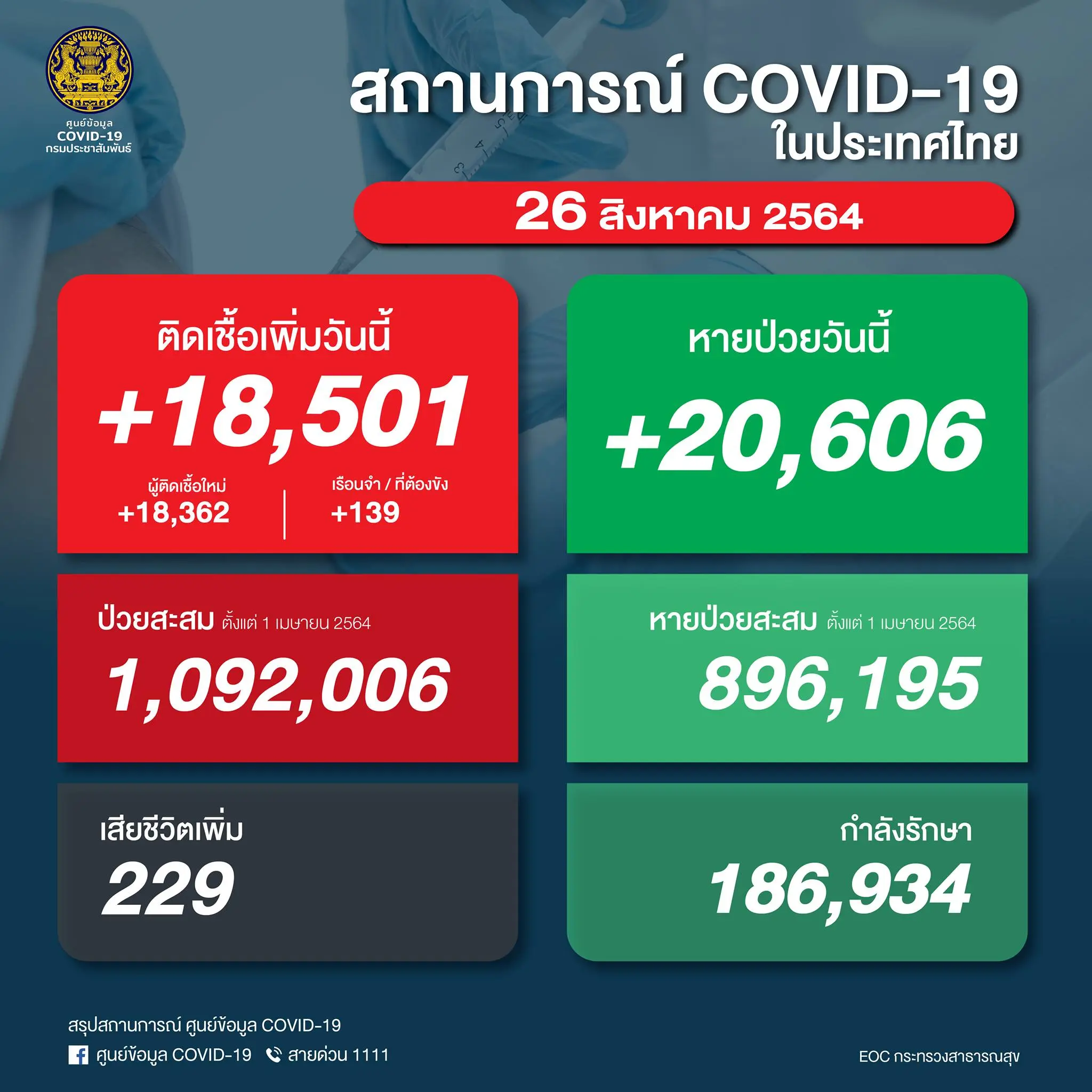โควิดวันนี้ — เมื่อวันที่ 26 สิงหาคม 2564 ศูนย์ข้อมูล COVID-19 รายงานยอดผู้ติดเชื้อ โควิด-19 โดยพบผู้ติดเชื้อรายใหม่เพิ่ม 18,362 ราย เสียชีวิต 229 ราย ทำให้การระบาดโควิด19 ระลอกใหม่ตั้งแต่เดือนเมษายน 2564 มียอดผู้เสียชีวิตรวม 10,220 ราย และยอดผู้เสียชีวิตสะสมจากการแพร่ระบาดของโควิด19 ตั้งแต่ปี 63 มีทั้งหมด 10,314 ราย สำหรับวันนี้มีรายงานผู้ติดเชื้อจากเรือนจำทั้งหมด 139 ราย รวมจำนวนผู้ติดเชื้อรายใหม่วันนี้ทั้งสิ้น 18,501 ราย