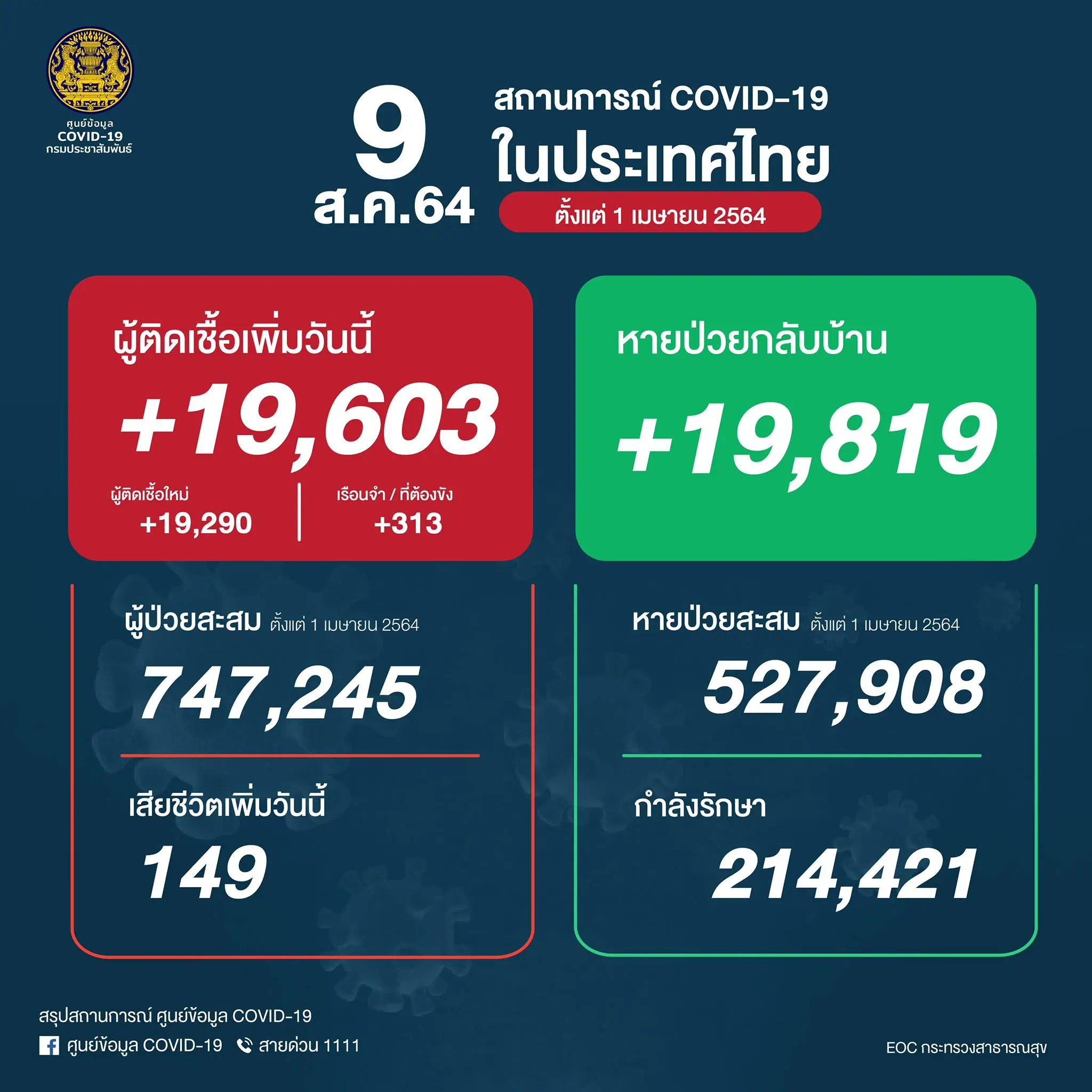 โควิดวันนี้ — เมื่อวันที่ 9 สิงหาคม 2564 ศูนย์ข้อมูล COVID-19 รายงานยอดผู้ติดเชื้อ โควิด-19 โดยพบผู้ติดเชื้อรายใหม่เพิ่ม 19,290 ราย เสียชีวิต 149 ราย ทำให้การระบาดโควิด19 ระลอกใหม่ตั้งแต่เดือนเมษายน 2564 มียอดผู้เสียชีวิตรวม 6,259 ราย และยอดผู้เสียชีวิตสะสมจากการแพร่ระบาดของโควิด19 ตั้งแต่ปี 63 มีทั้งหมด 6,353 ราย สำหรับวันนี้มีรายงานผู้ติดเชื้อจากเรือนจำทั้งหมด 313 ราย รวมจำนวนผู้ติดเชื้อรายใหม่วันนี้ทั้งสิ้น 19,603 ราย
