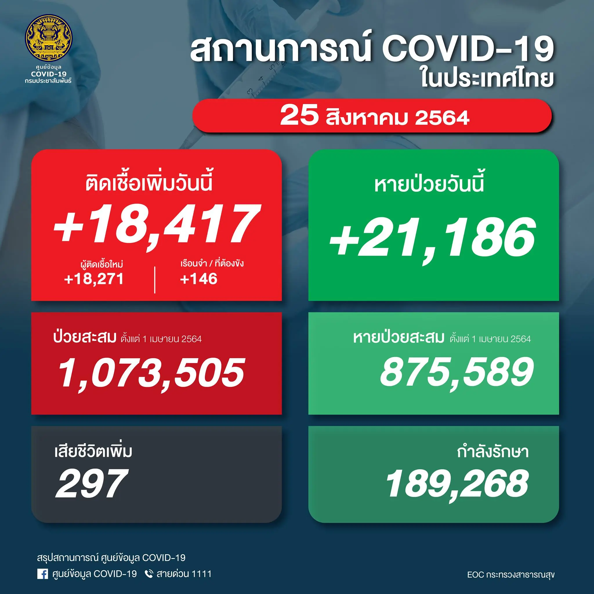 โควิดวันนี้ — เมื่อวันที่ 25 สิงหาคม 2564 ศูนย์ข้อมูล COVID-19 รายงานยอดผู้ติดเชื้อ โควิด-19 โดยพบผู้ติดเชื้อรายใหม่เพิ่ม 18,271 ราย เสียชีวิต 297 ราย ทำให้การระบาดโควิด19 ระลอกใหม่ตั้งแต่เดือนเมษายน 2564 มียอดผู้เสียชีวิตรวม 9,991 ราย และยอดผู้เสียชีวิตสะสมจากการแพร่ระบาดของโควิด19 ตั้งแต่ปี 63 มีทั้งหมด 10,085 ราย สำหรับวันนี้มีรายงานผู้ติดเชื้อจากเรือนจำทั้งหมด 146 ราย รวมจำนวนผู้ติดเชื้อรายใหม่วันนี้ทั้งสิ้น 18,417 ราย