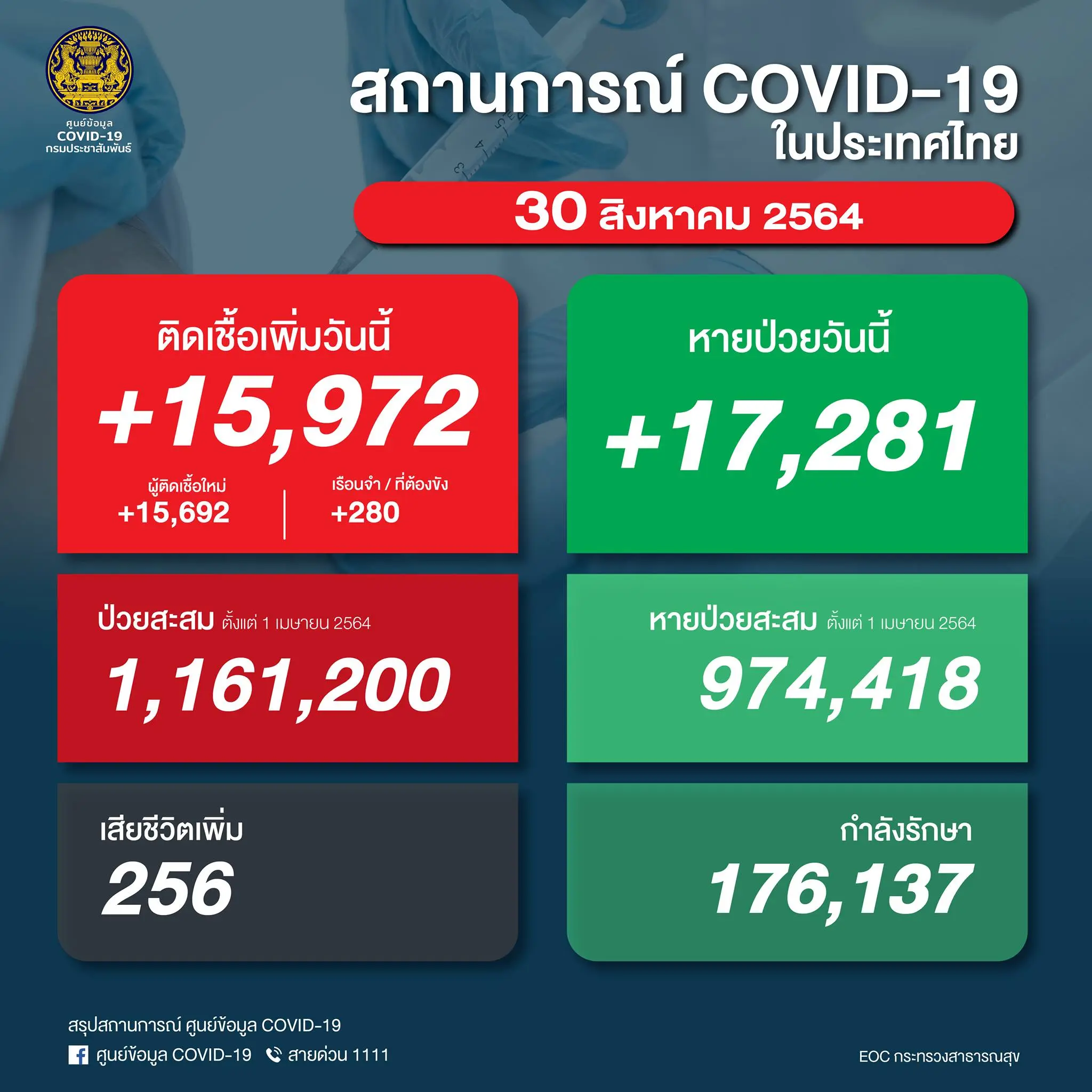 โควิดวันนี้ — เมื่อวันที่ 30 สิงหาคม 2564 ศูนย์ข้อมูล COVID-19 รายงานยอดผู้ติดเชื้อ โควิด-19 โดยพบผู้ติดเชื้อรายใหม่เพิ่ม 15,692 ราย เสียชีวิต 256 ราย ทำให้การระบาดโควิด19 ระลอกใหม่ตั้งแต่เดือนเมษายน 2564 มียอดผู้เสียชีวิตรวม 11,305 ราย และยอดผู้เสียชีวิตสะสมจากการแพร่ระบาดของโควิด19 ตั้งแต่ปี 63 มีทั้งหมด 11,399 ราย สำหรับวันนี้มีรายงานผู้ติดเชื้อจากเรือนจำทั้งหมด 280 ราย รวมจำนวนผู้ติดเชื้อรายใหม่วันนี้ทั้งสิ้น 15,972 ราย