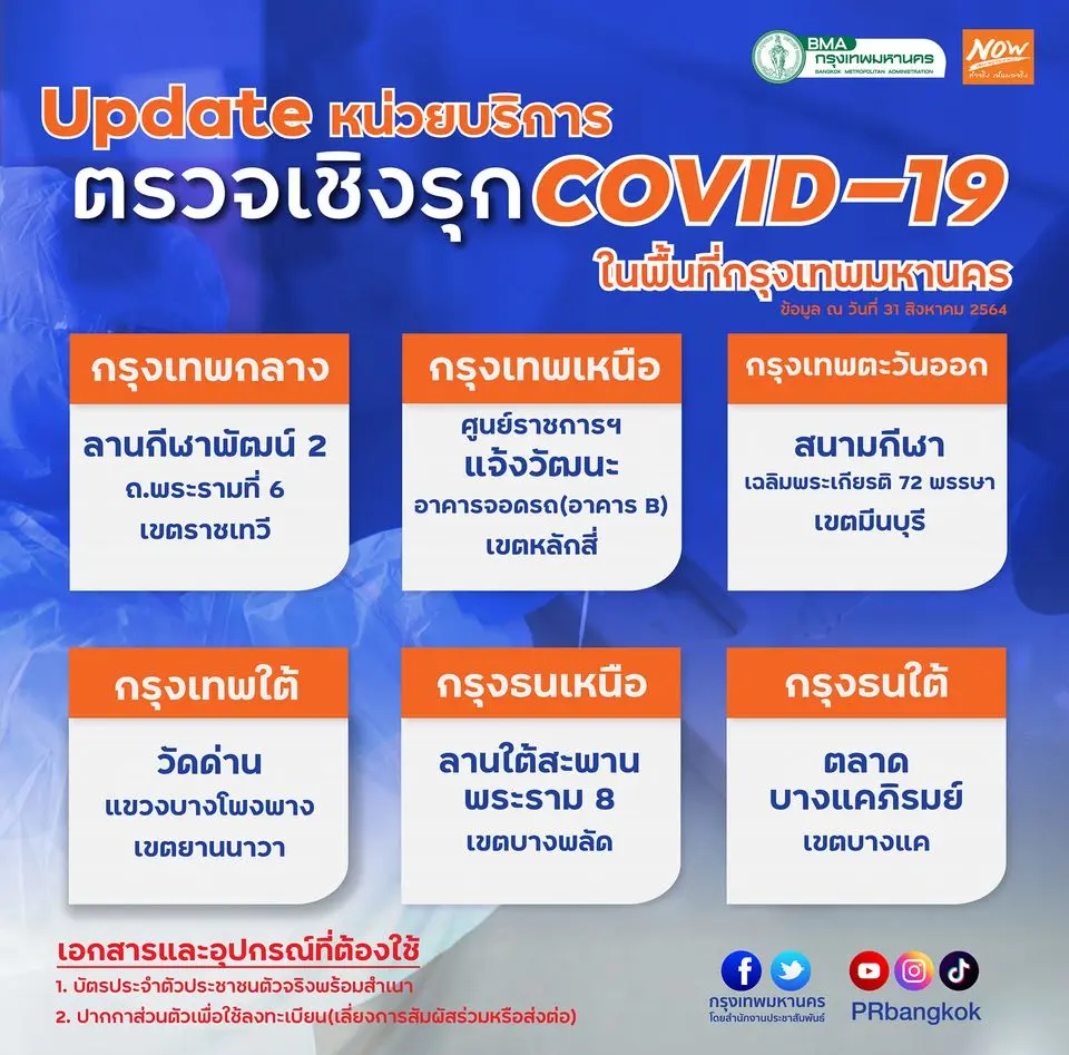 เฟซบุ๊กเพจ กรุงเทพมหานคร โดยสำนักงานประชาสัมพันธ์ ได้เผยแพร่ประกาศหน่วยบริการตรวจเชิงรุกโควิด-19 ในพื้นที่กรุงเทพมหานคร วันที่ 1-30 กันยายน 2564 โดยมีหน่วยให้บริหารทั้ง 6 จุด ดังนี้