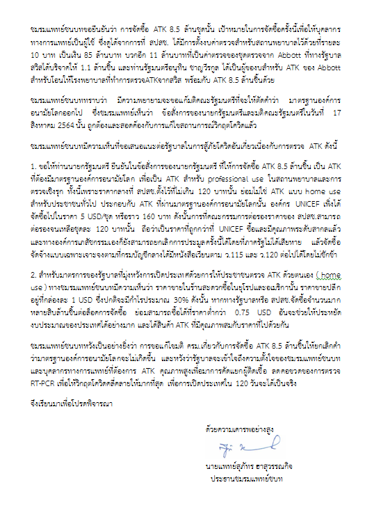 เรื่อง ขอให้ทางคณะรัฐมนตรียืนยันการจัดซื้อชุดตรวจ ATK 8.5 ล้านชิ้น ที่ต้องได้มาตรฐานองค์การอนามัยโลก เพื่อให้บุคลากรทางการแพทย์ใช้ในการควบคุมโรคโควิด