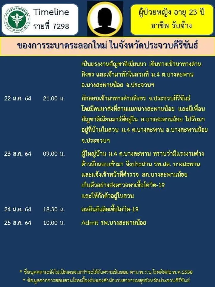 เมื่อวันที่ 29 สิงกาคม 2564 ผู้สื่อข่าวรายงานว่า พบไทม์ไลน์ข้องผู้ป่วยโควิดเพศหญิงรายหนึ่งสัญชาติเมียนมา อายุ 23 ปี อาชีพรับจ้าง ติดเชื้อโควิด เป็นรายที่ 7298 ของการระบาดระบอกใหม่