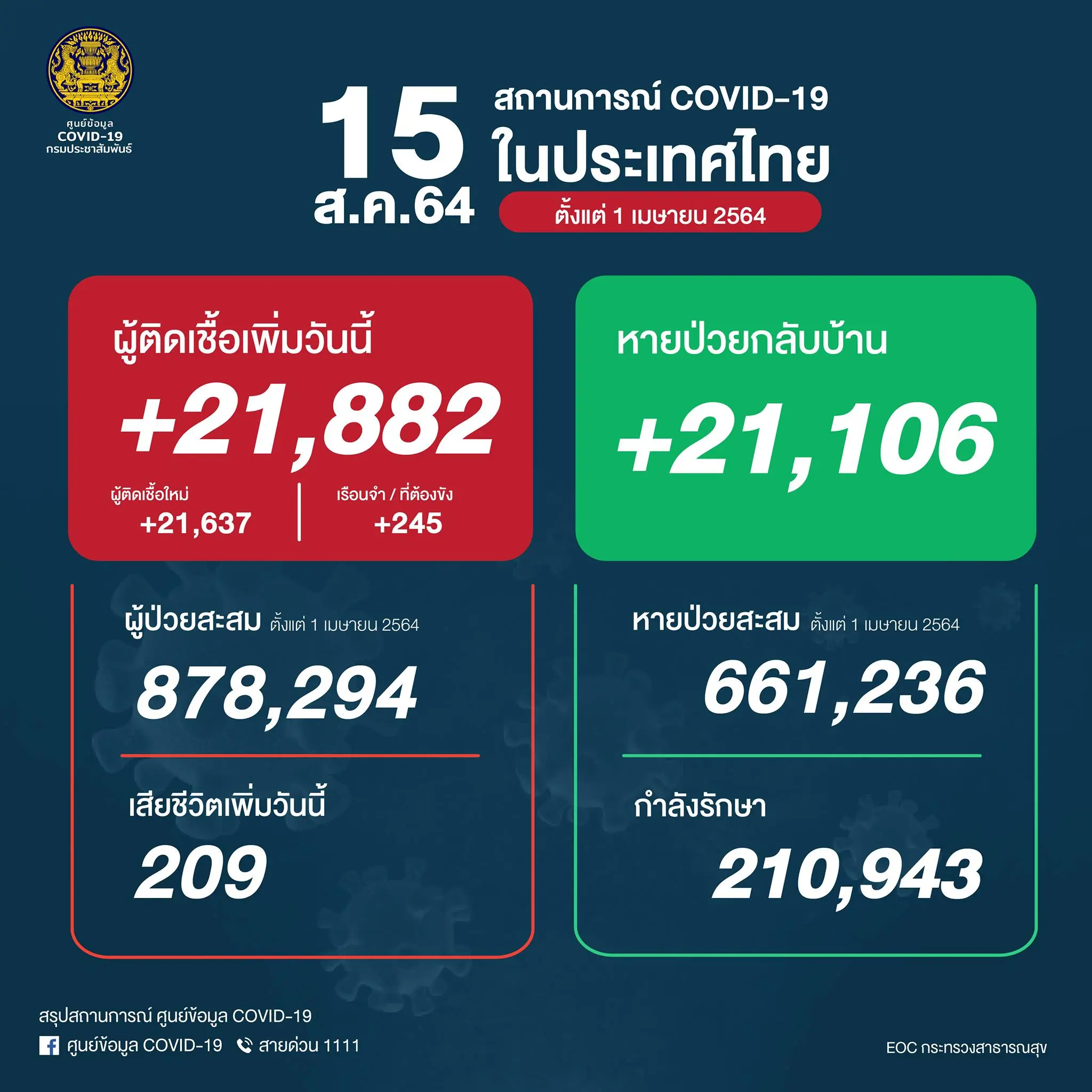 โควิดวันนี้ — เมื่อวันที่ 15 สิงหาคม 2564 ศูนย์ข้อมูล COVID-19 รายงานยอดผู้ติดเชื้อ โควิด-19 โดยพบผู้ติดเชื้อรายใหม่เพิ่ม 21,637 ราย เสียชีวิต 209 ราย ทำให้การระบาดโควิด19 ระลอกใหม่ตั้งแต่เดือนเมษายน 2564 มียอดผู้เสียชีวิตรวม 7,458ราย และยอดผู้เสียชีวิตสะสมจากการแพร่ระบาดของโควิด19 ตั้งแต่ปี 63 มีทั้งหมด 7,552 ราย สำหรับวันนี้มีรายงานผู้ติดเชื้อจากเรือนจำทั้งหมด 375 ราย รวมจำนวนผู้ติดเชื้อรายใหม่วันนี้ทั้งสิ้น 21,882 ราย