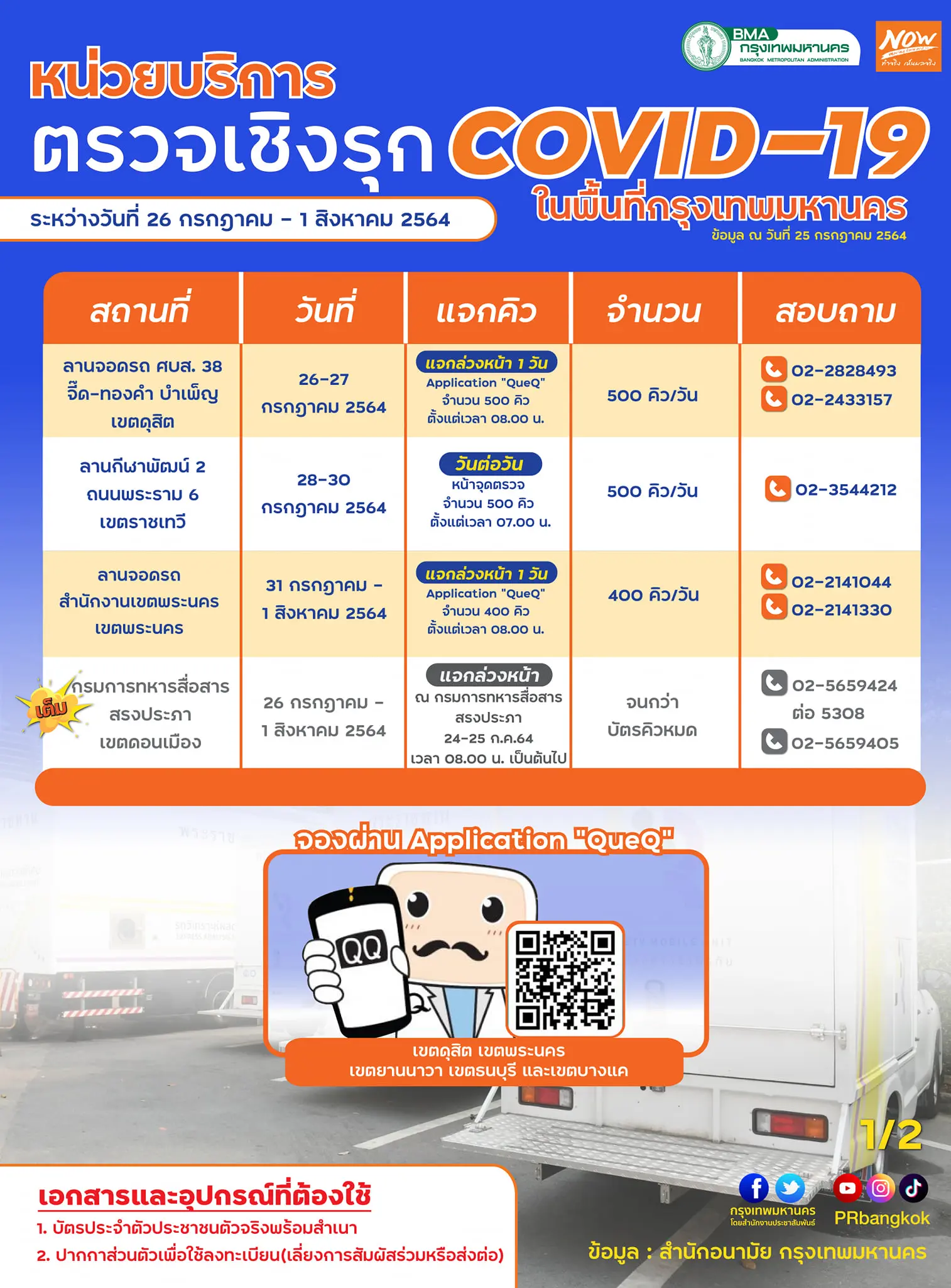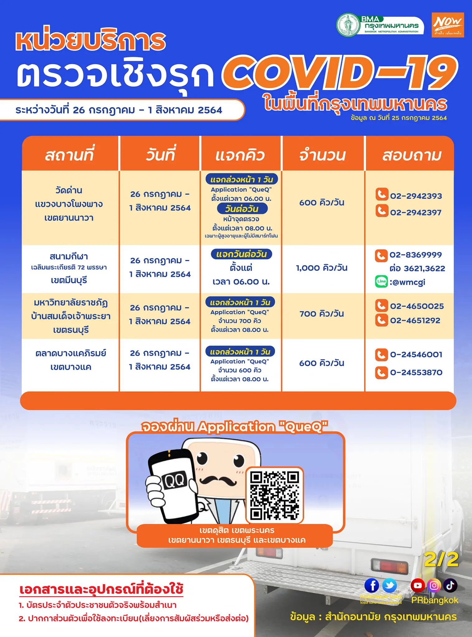 เมื่อวันที่ 25 กรกฎาคมที่ผ่านมา เฟซบุ๊ก ศูนย์ข้อมูล COVID-19 ได้อัพเดทหน่วยบริการตรวจเชิงรุกโควิด-19 ในพื้นที่กรุงเทพมหานคร ระหว่างวันที่ 26 กรกฎาคม ถึง 1 สิงหาคม 2564 โดยมีรายละเอียดสถานที่ทั้ง 8 แห่ง รวมถึงวันแจกคิวล่วงหน้า และเบอร์ติดต่อ ดังนี้