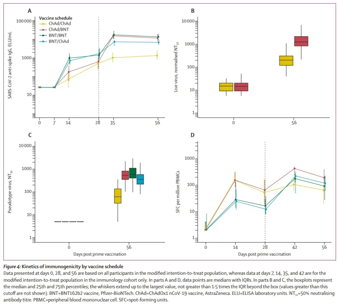 ที่น่าสนใจคือการศึกษาในประเทศอังกฤษ (ดังในรูป) ที่ทดลองไขว้วัคซีนในอาสาสมัครอายุเกิน 50 ปีที่ไม่มีโรคเสี่ยงหรือมีแต่โรคนั้นๆ ไม่รุนแรงและควบคุมได้ดี โดยประชากรทั้งหมดที่ศึกษาเป็นชาวเอเชียราว 10+% พบว่าการฉีดวัคซีนของแอสตราแล้วไขว้ด้วยของไฟเซอร์ห่างกัน 4 สัปดาห์ ให้ภูมิคุ้มกันที่วัดทั้ง 4 วิธีขึ้นสูงใกล้เคียงกับการฉีดของไฟเซอร์ทั้งสองเข็ม และดีกว่าการฉีดของไฟเซอร์แล้วตามด้วยของแอสตรา อีกทั้งดีกว่าการฉีดของแอสตราสองเข็มมากทีเดียว (ดังในรูป)