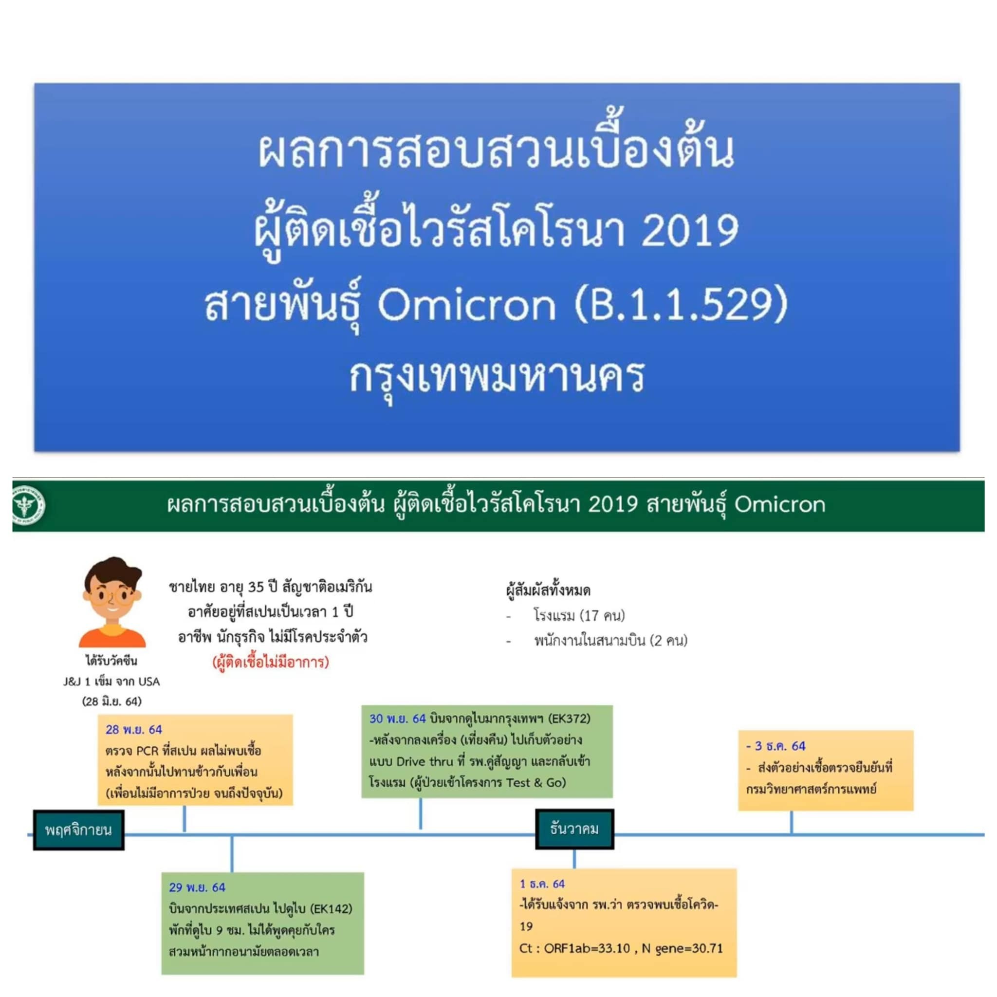 วันที่ 1 ธ.ค. รับแจ้งจากโรงพยาบาลว่าตรวจพบโควิด และวันที่ 3 ธ.ค.ส่งตัวอย่างเชื้อตรวจยืนยันที่กรมวิทยาศาสตร์ เบื้องต้นค่อนข้างแน่นอนว่า เป็นสายพันธุ์โอไมครอน รายแรกของไทย