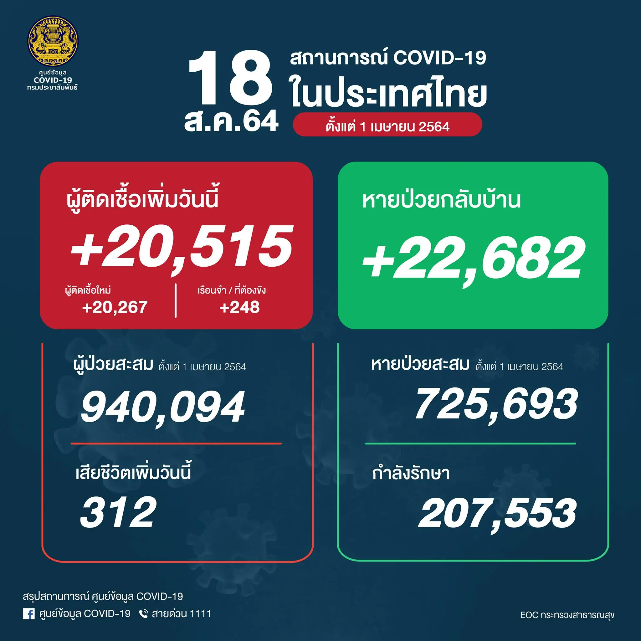 โควิดวันนี้ — เมื่อวันที่ 18 สิงหาคม 2564 ศูนย์ข้อมูล COVID-19 รายงานยอดผู้ติดเชื้อ โควิด-19 โดยพบผู้ติดเชื้อรายใหม่เพิ่ม 20,267 ราย เสียชีวิต 312 ราย ทำให้การระบาดโควิด19 ระลอกใหม่ตั้งแต่เดือนเมษายน 2564 มียอดผู้เสียชีวิตรวม 8,191 ราย และยอดผู้เสียชีวิตสะสมจากการแพร่ระบาดของโควิด19 ตั้งแต่ปี 63 มีทั้งหมด 8,285 ราย สำหรับวันนี้มีรายงานผู้ติดเชื้อจากเรือนจำทั้งหมด 248 ราย รวมจำนวนผู้ติดเชื้อรายใหม่วันนี้ทั้งสิ้น 20,515 ราย
